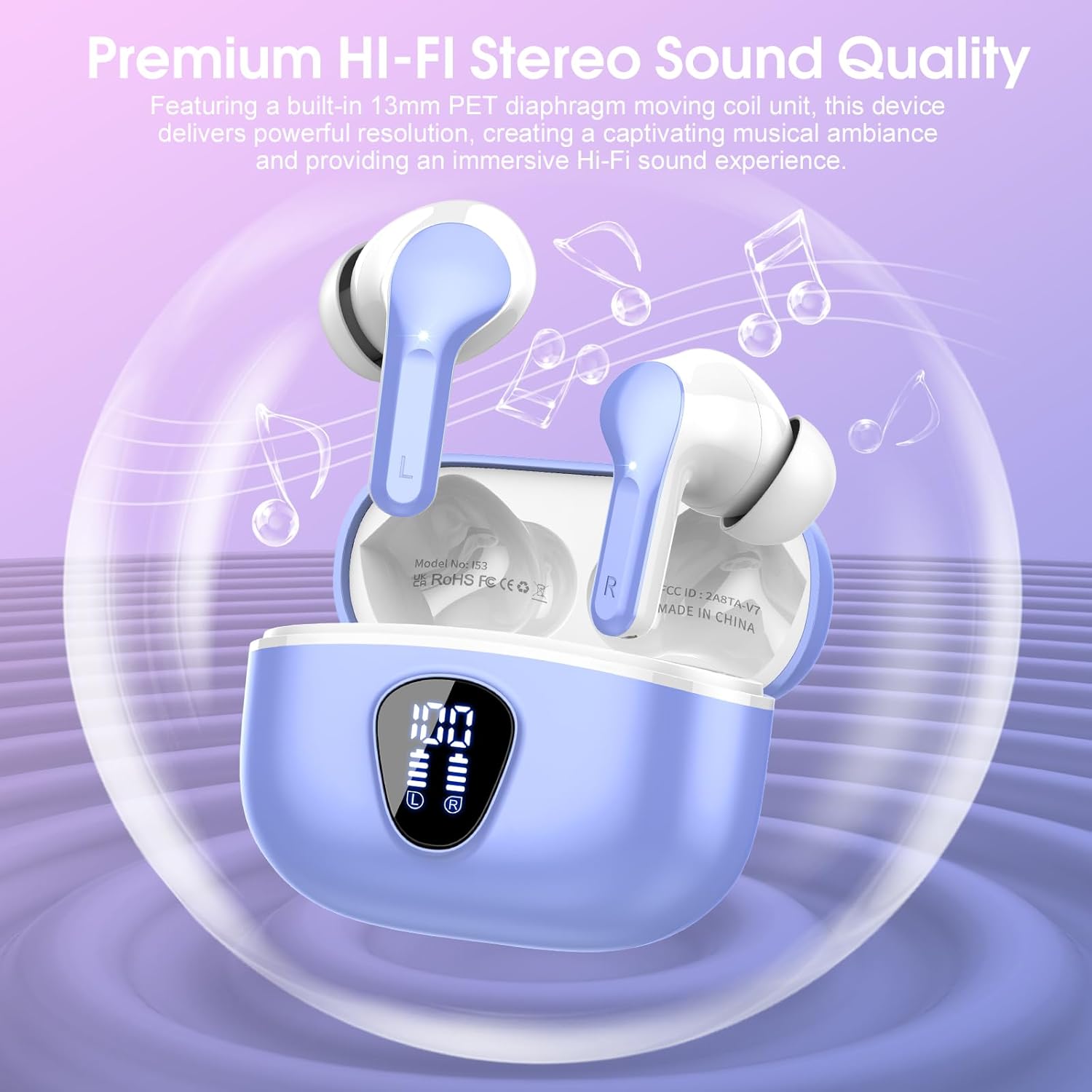 Wireless Earbuds, Bluetooth 5.4 Headphones HiFi Stereo, Bluetooth Earbuds with ENC Noise Cancelling Mic, IP7 Waterproof in Ear Earphones, 48H, LED Display Ear buds for Pad Workout Sports, White Purple