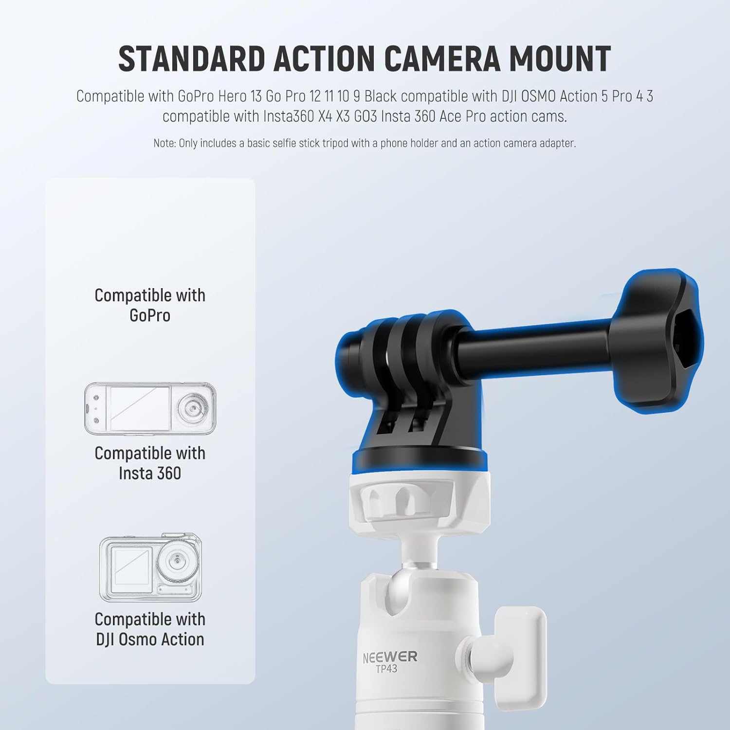 - 【Tripod for Phone & Action Camera】 The desktop selfie stick stand adjustable phone holder is compatible with iPhone 16 15 Pro Max Plus i Phone 14 Samsung Galaxy S25 S24 S23 Ultra Google Pixel 9 8 7 Pro Android mobile, with one cold shoe for photography accessories or filming gears like a monitor, fill light, microphone. The mount adapter is compatible with GoPro Hero 13 Go Pro 12 11 10 Black compatible with DJI OSMO Action 5 Pro 4 3 compatible with Insta360 X5 X4 X3 GO 3S Insta 360 Ace Pro etc
