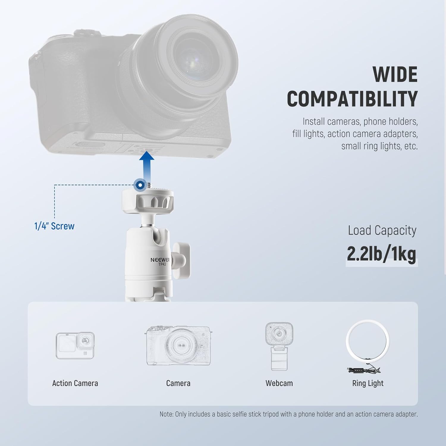 NEEWER Basics Mini Desk Selfie Stick Tripod Compatible with iPhone GoPro Insta360 DJI, Portable Small Camera Webcam Android Cell Phone Holder Ball Head Elevated Axis Video Recording Stand, TP43 White