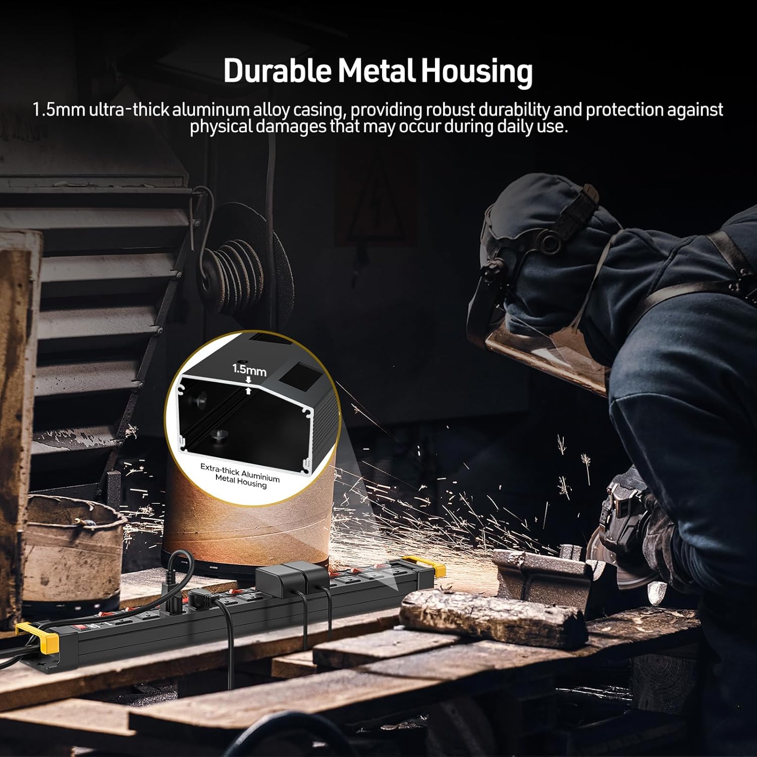 - Durable Metal Housing & Mountable Design:Built with 1.5mm thick aluminum alloy housing and reinforced engineering plastic, this surge protector is highly durable and suitable for rugged environments like garages, workshops, and offices. It also features mounting holes and a cord manager for easy wall or under-table installation, keeping your space organized and clutter-free.