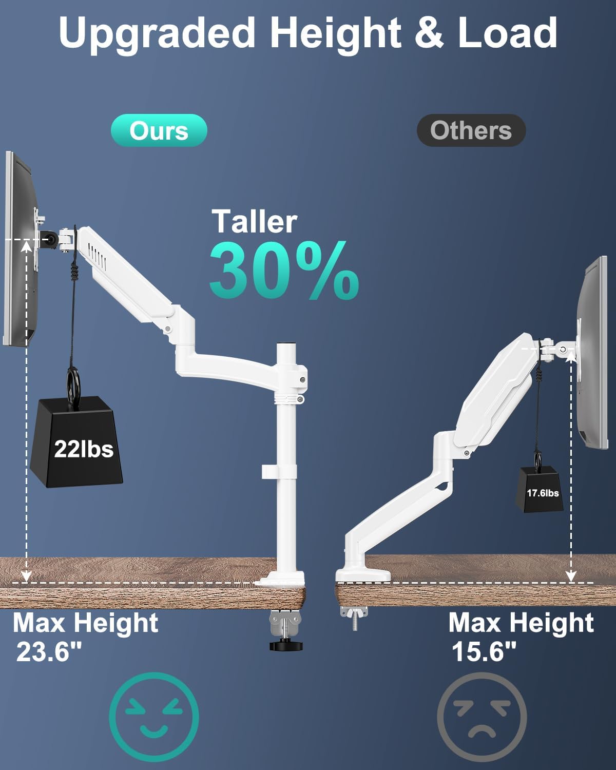 - Raise Your View - The computer monitor stand features a 14.5 inch central pole that elevates the screen to a higher position. Compared to the regular gas spring monitor mount, this single tall monitor arm can achieve a 30% increase in height, allowing the monitor to reach a maximum height of 23.6 inch. In addition, and maximum extension is up to 20.3 inch. All the design is ideal for ergonomic viewing, can adjust the monitor according to your physical condition and workflow.