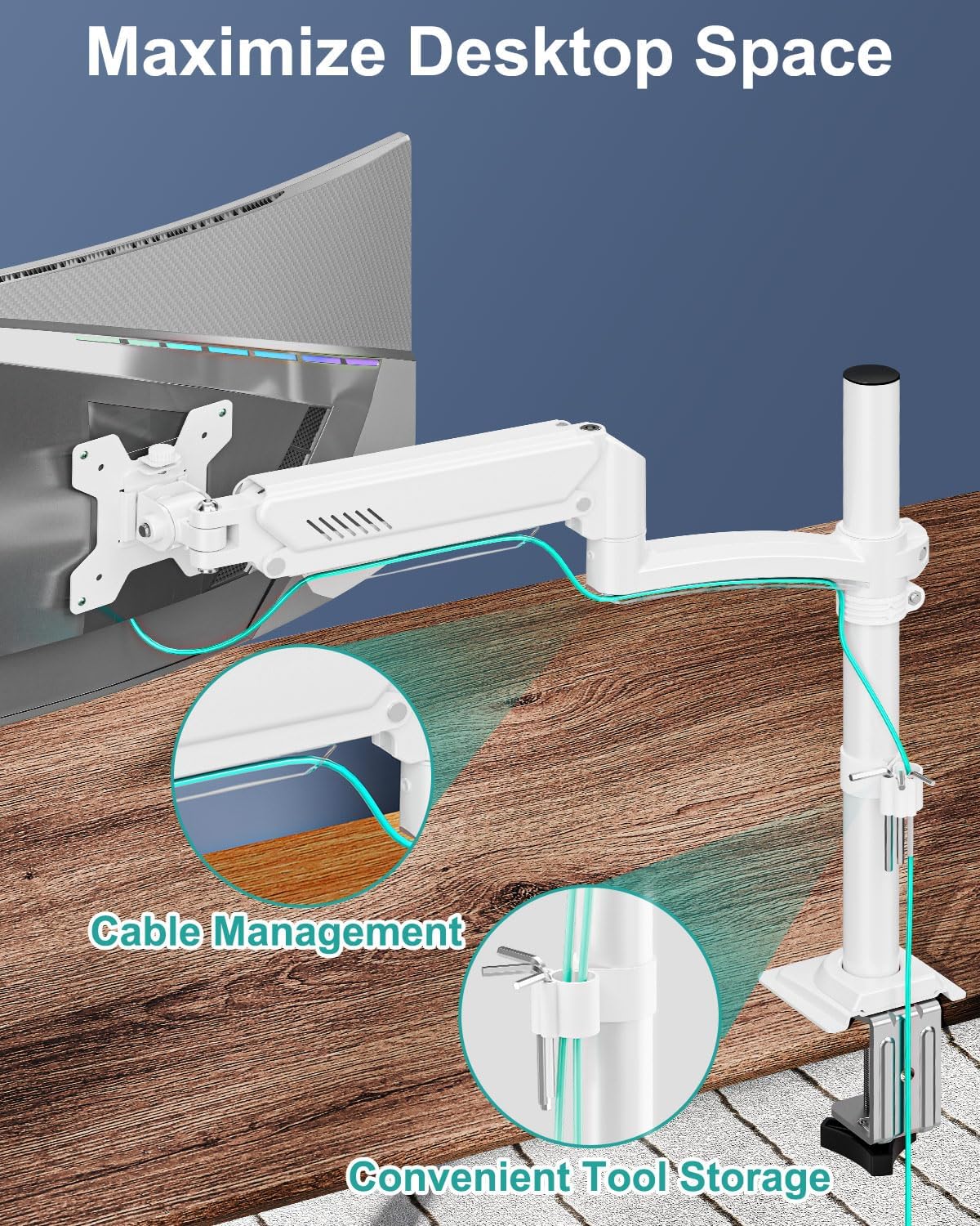 - Free Up Your Desk Space - The desk mount monitor stand is installed behind the desk, taking minimal desktop space, and it saves up to 80% more available desktop space by raising the screen for a keyboard, mouse, laptop or other desk accessories. The monitor arm is also designed with cable management functionality, allowing you to neatly route cables for a neater look, making your workspace cleaner and more organized.
