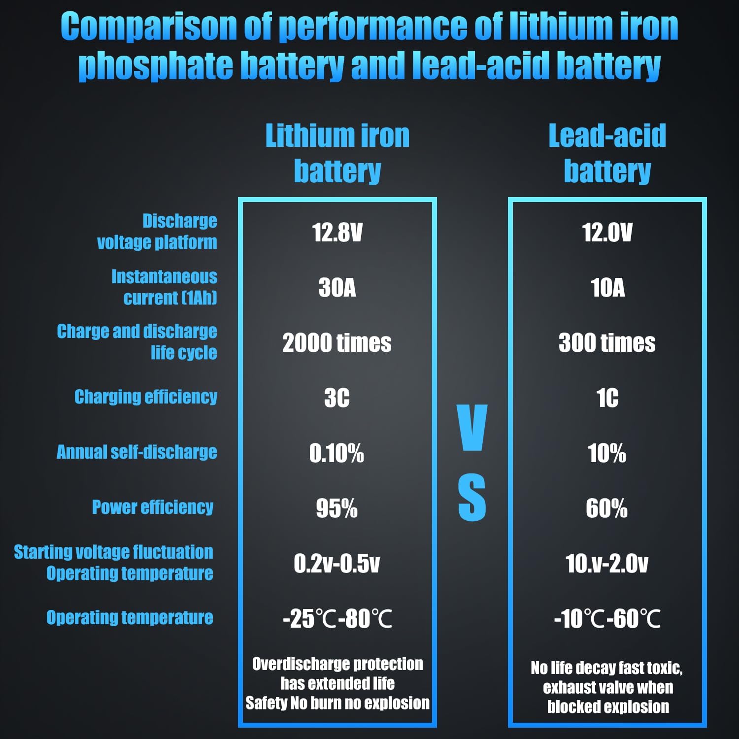 - LiFePo4 lithium-ion lithium automotive battery with excellent safety performance: we use safe, stable, high-multiplier lithium iron phosphate battery material, the battery is equipped with BMS control circuit, the safety performance is better than ordinary lead-acid batteries. Supports complex on-board electronic systems with high power demand, including start/stop functions.