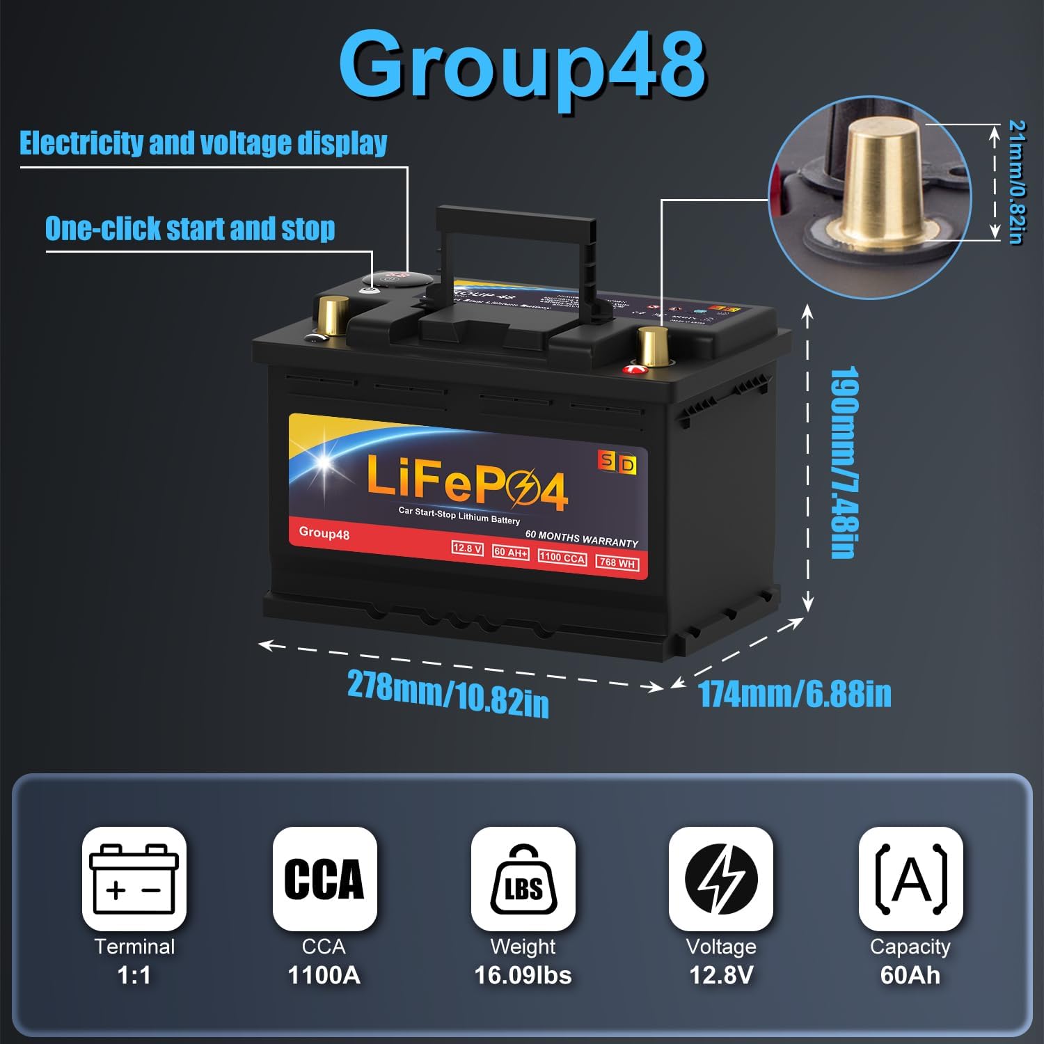 Lithium Start-Stop Car Battery GROUP 48, 12.8V 60Ah 1100CCA LiFePO4 Automotive Battery For Car, With LED Display and Emergency Start Button 60 Months Warranty