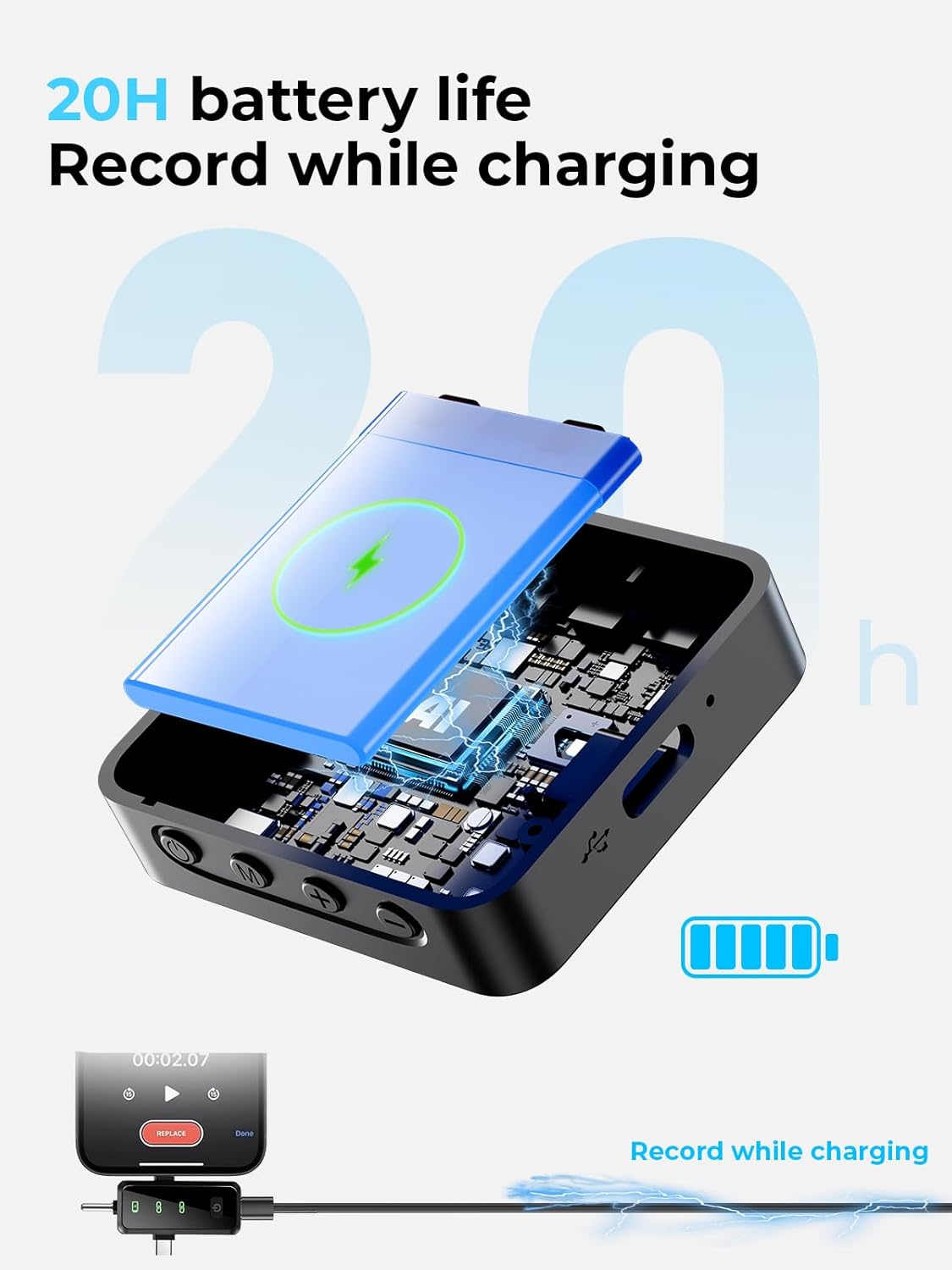 - 20-Hour Marathon Runtime: Twin transmitters deliver 20h continuous operation. Live-charging support + exclusive quick-charge extends mini microphone runtime—10-min boost powers 2h emergency sessions,eliminating recording interruptions