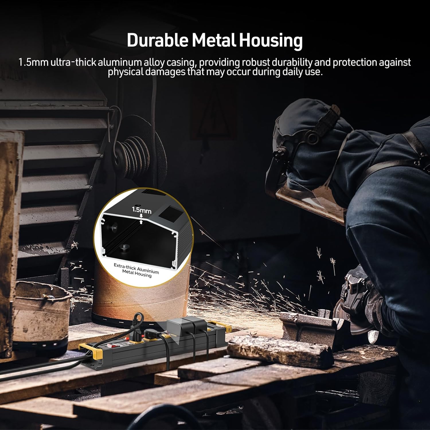 - 【Comprehensive Safety Protection】This metal power strip offers a 1020 joule surge protector, a 15 amp circuit breaker, and a temperature fuse. It safeguards your devices from power spikes and overcurrent, automatically shutting down in case of abnormalities. Enjoy comprehensive protection for your devices with this advanced power strip. SGS Certification.