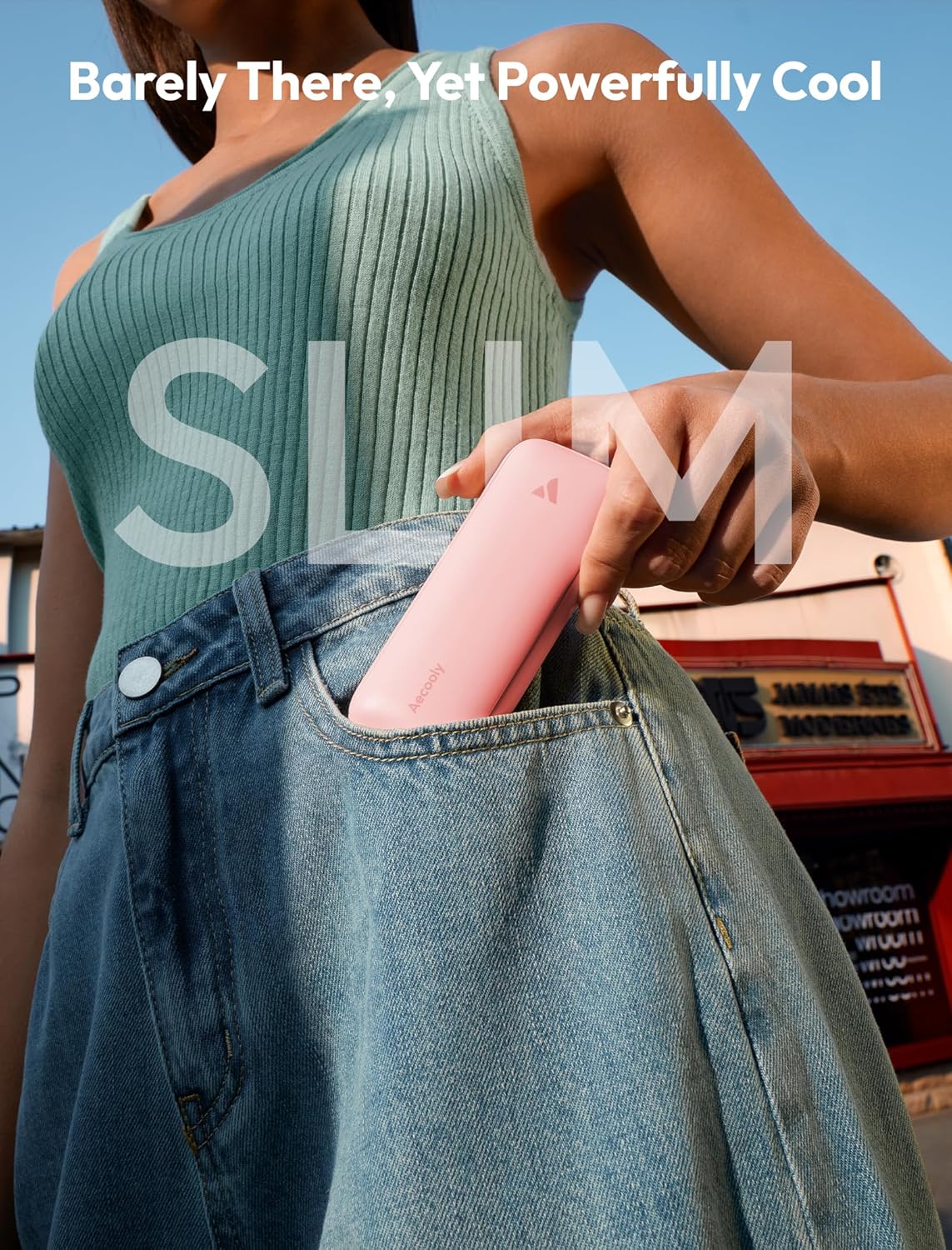 - Slim & Elegant Design: Aecooly Slim Handheld Fan designed for ultimate portability, this fan features a remarkably slim profile and lightweight build. Its sleek and compact form fits effortlessly into your hand, bag, or pocket, combining practicality with modern aesthetics