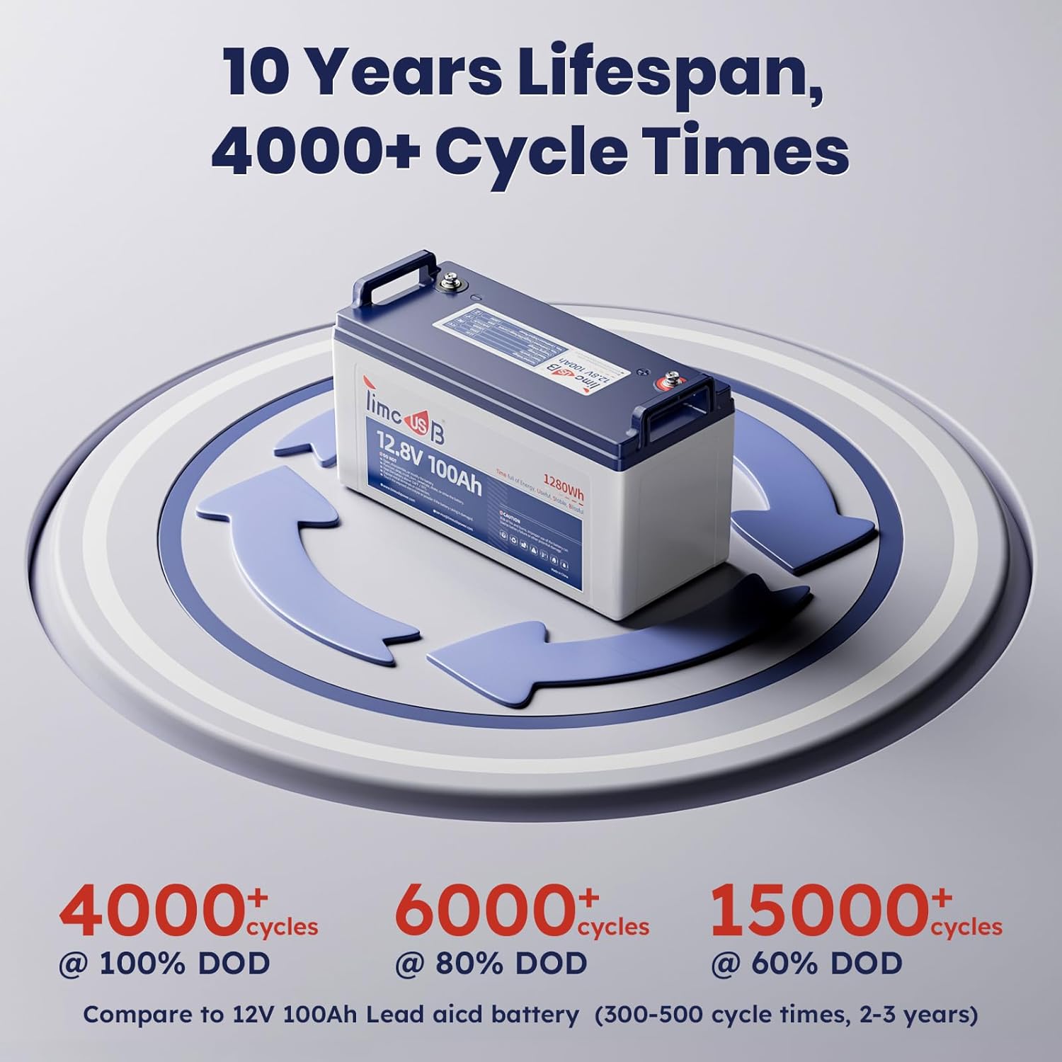 - ✅ Built-in 100A BMS for Ultimate Protection:The Timeusb 12.8V 100Ah LiFePO4 battery features an advanced 100A Battery Management System (BMS) that safeguards against overcharging, over-discharging, overcurrent, overheating, and short circuits. Enjoy peace of mind with enhanced safety and extended battery life for all your power needs.