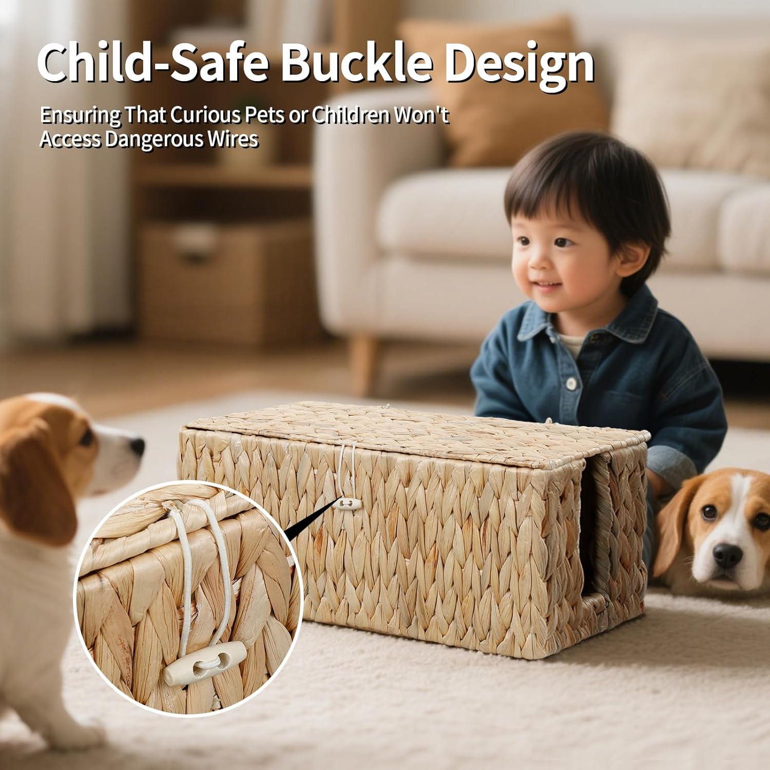 - 【Ensure Family Safety】Keeping your home safe is our priority. The cord hider box features a child-safe design with secure clasps on one side ends, ensuring that curious pets or children won't access dangerous wires. open-weave design allows for proper airflow to prevent overheating of cablesThis cord organizer box provides a secure, safe environment by effectively hiding cables