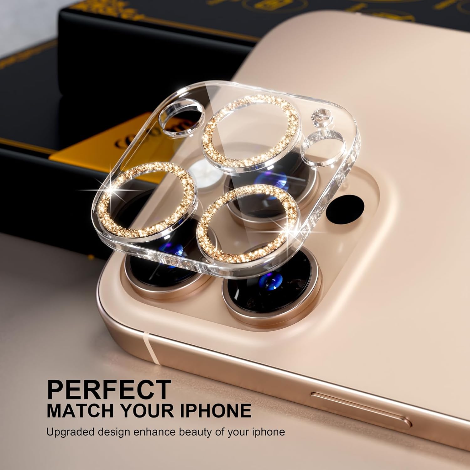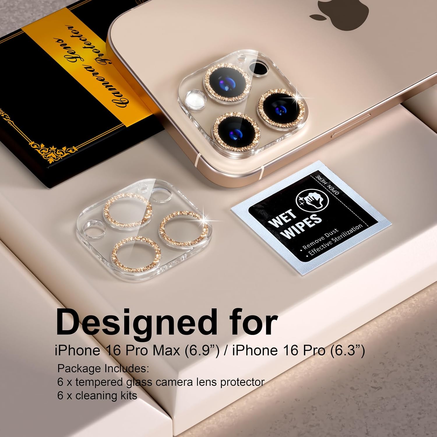 beuxece for 6 Pack iPhone 16 Pro/iPhone 16 Pro Max Camera Lens Protector [Drop Protection] [Case Friendly] [Easy Installation] 9H Tempered Glass Camera Screen Protector Cover, Glitter Gold
