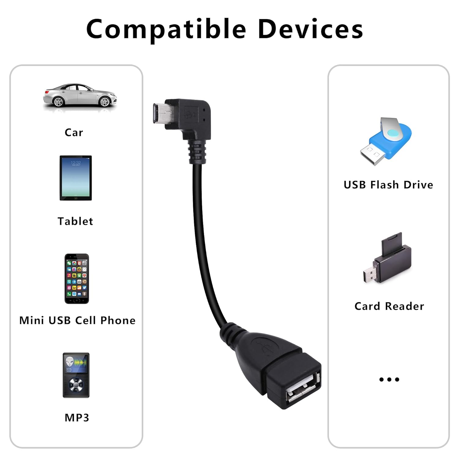 - 【Compatible Devices】Mini USB 5-pin male to USB A female adapter cable is suitable for car media players, digital cameras, MP3, MP4, cell phones, tablets and other devices.