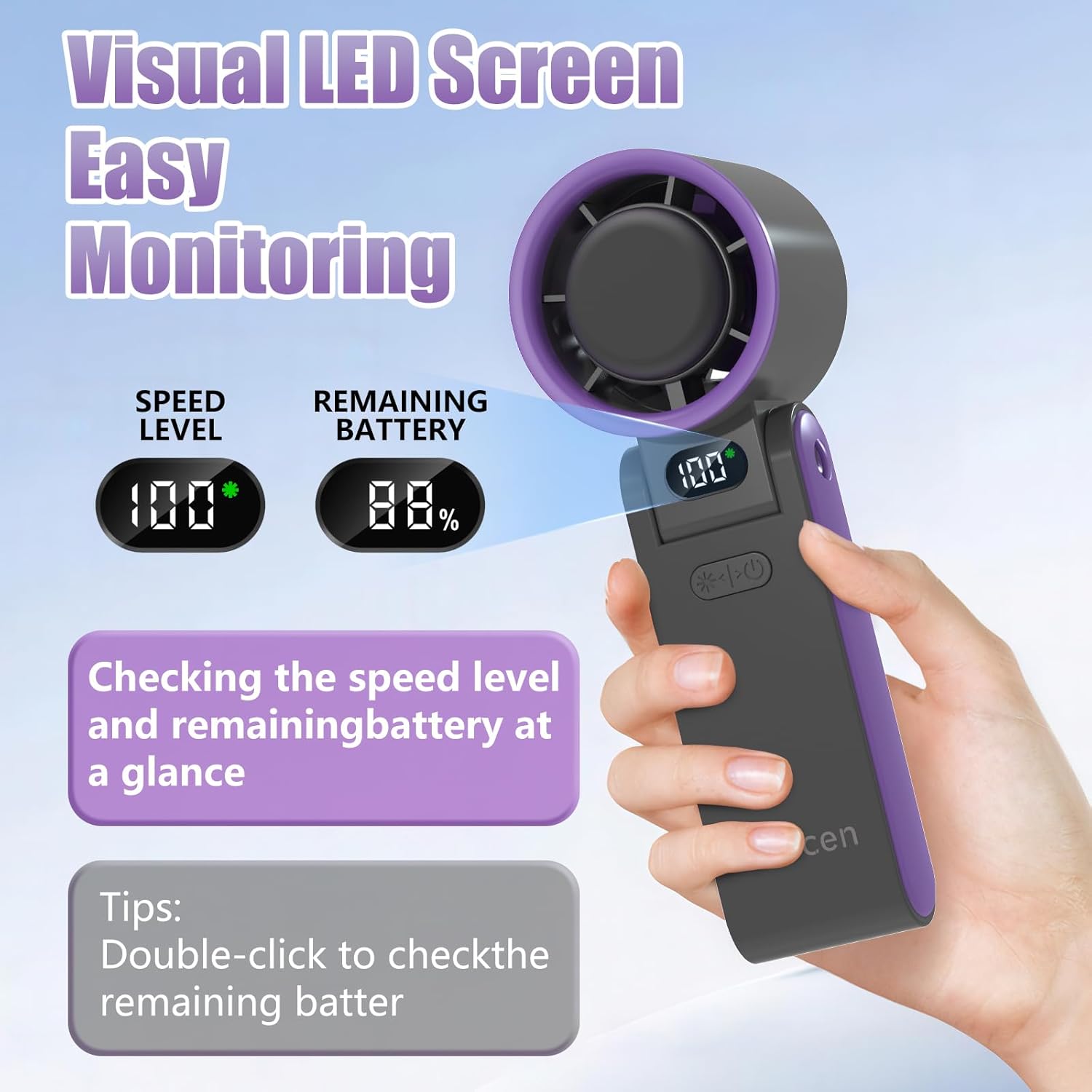 - Smart LED Display Panel: Stay informed with a clear LED display showing the small portable fan's real-time battery status and wind speed settings at a glance. No more guessing when the mini fan handheld needs to recharge