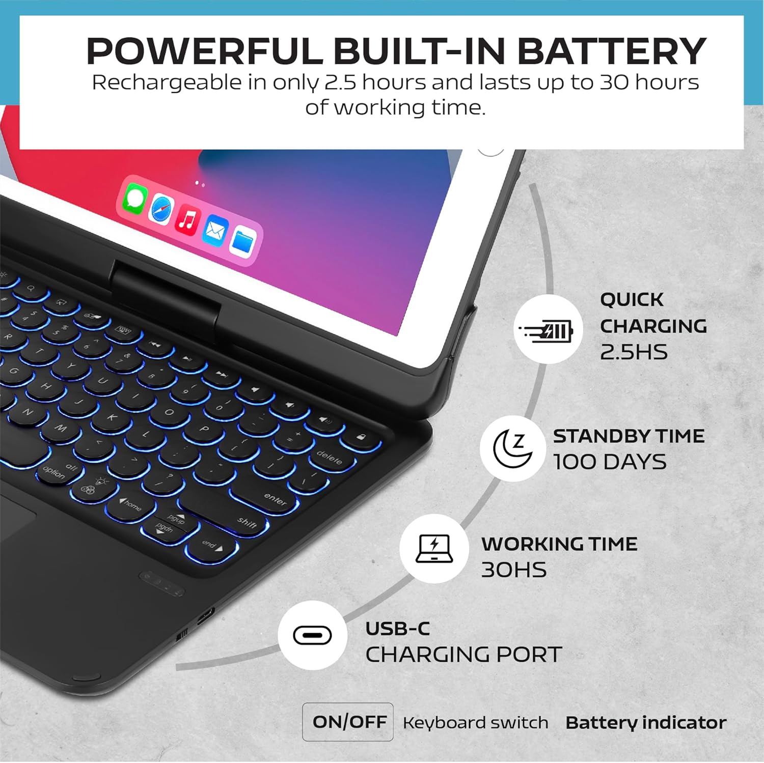 - 【5.0 Bluetooth, Long-lasting Battery and Built-in Pencil Slot】Featuring version 5.0 of the Bluetooth chipset, which means an almost instant connection to your iPad. the keyboard is backlit and can be brightened or dimmed as needed. Up to 30 hours of continuous operation/100 days of standby time on a single charge.Apple Pencil holder for easy carrying and use