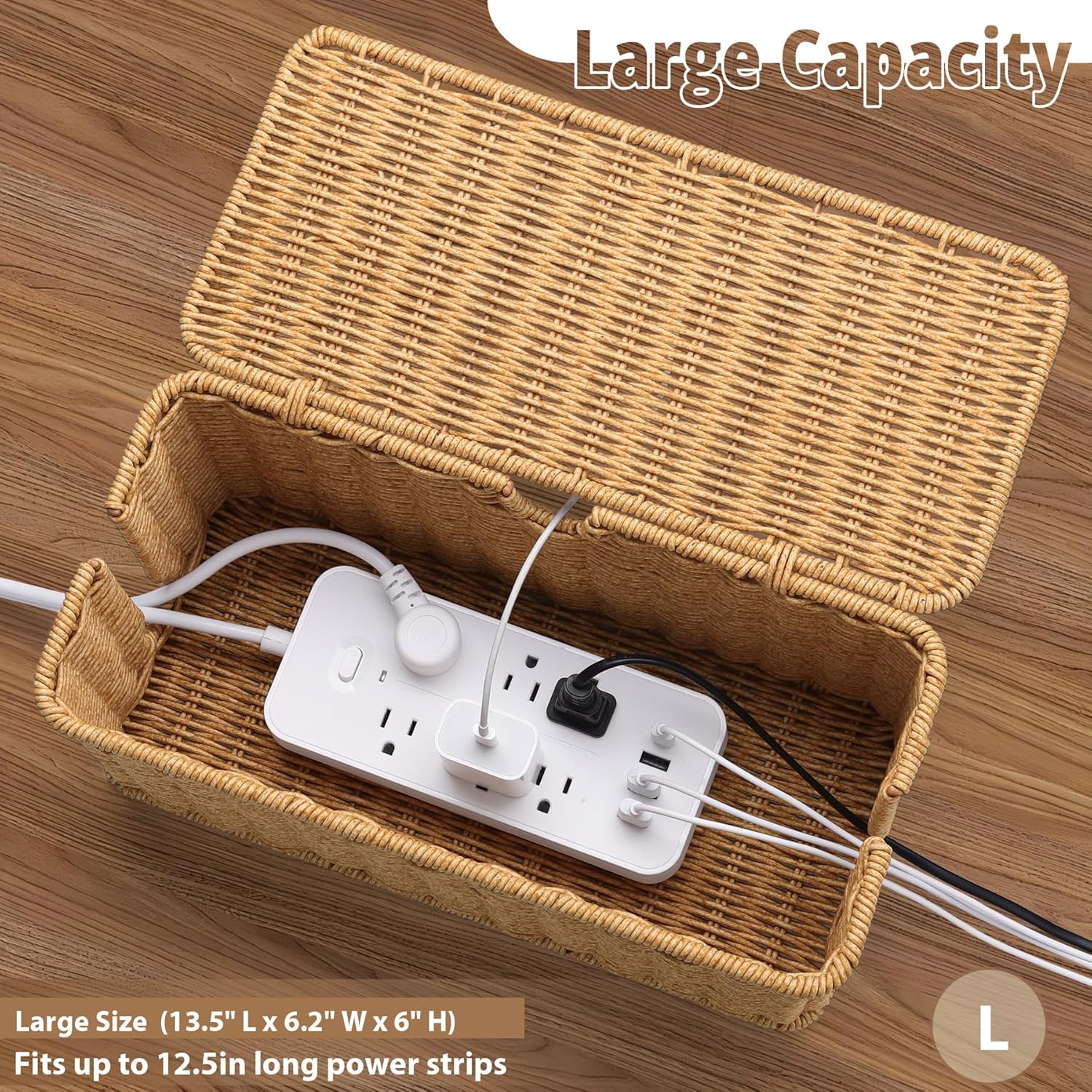 2Pack Large Cable Management Box, Handwoven Imitation Rattan Cord Organizer wire Hider Box, Desk Cord Management to Hide Cords and Power Strips