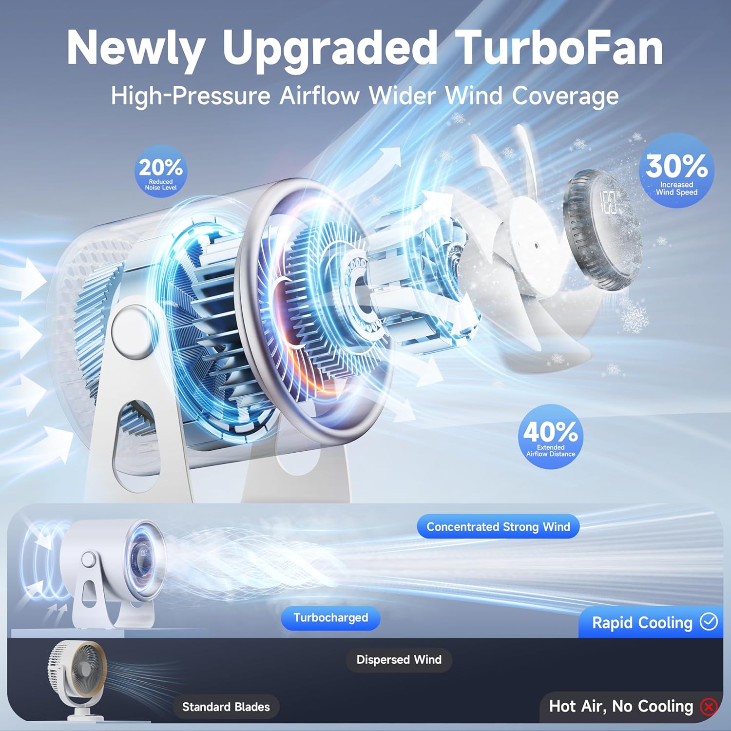 - 【Ultra-Silent Turbo System for Desk Fans Small Quiet】Engineered with an innovative turbocharged motor and fluid dynamics noise reduction, operates at a whisper-quiet 28.8 dB—quieter than rustling book pages (30 dB). The 7-blade spiral turbine spins at 3,000 RPM, paired with a circular airflow duct that delivers 150% stronger wind than conventional fans. The 1-100 stepless dial lets you glide from a gentle breeze to hurricane-force cooling with a flick of your wrist.)