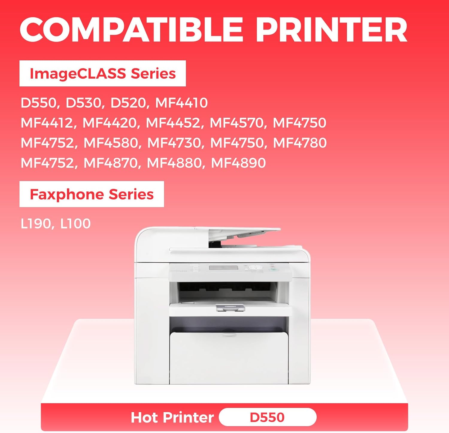 - Compatible Printers: Compatible with Canon ImageCLASS Series:D550 D530 D520 MF4410 MF4412 MF4420 MF4452 MF4570 MF4750, ImageCLASS Series:MF4752 MF4580 MF4730 MF4750 MF4780 MF4752 MF4870 MF4880 MF4890, Faxphone Series:L190 L100 Series Pprinter.