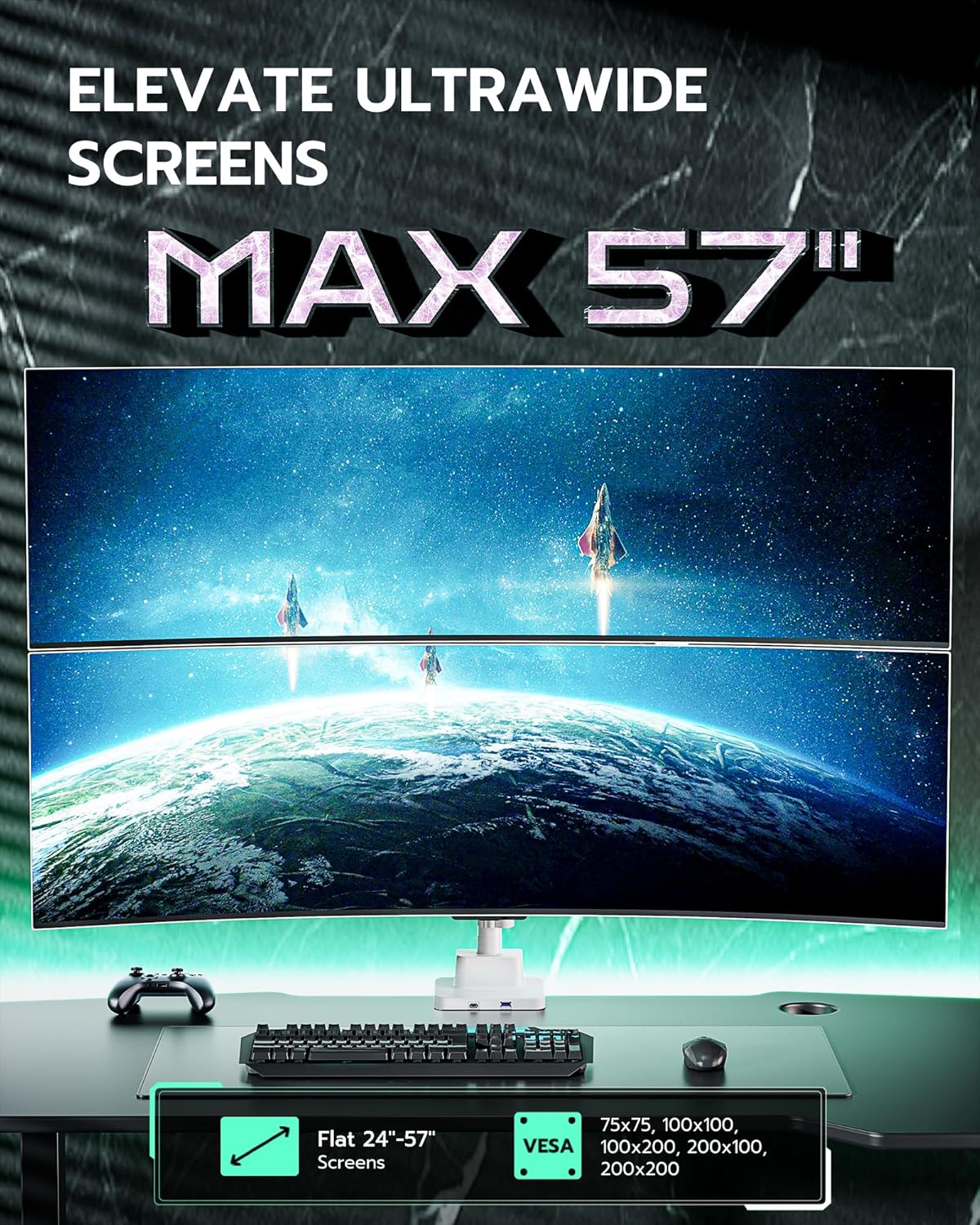 - 【Born for Ultrawide Screens】Designed for ultrawide heavy duty computer monitors, this dual stacked monitor mount supports flat and curved screens up to 57 inches per arm, holding flat monitors up to 59 lbs and curved monitor up to 48 lbs. Compatible with the Samsung Odyssey G9, LG, and other 49 " and 57 " ultrawide monitors, this dual screen monitor includes VESA mount adapters fitting 75x75 mm, 100x100 mm, 100x200 mm, 200x100 mm and 200x200 mm