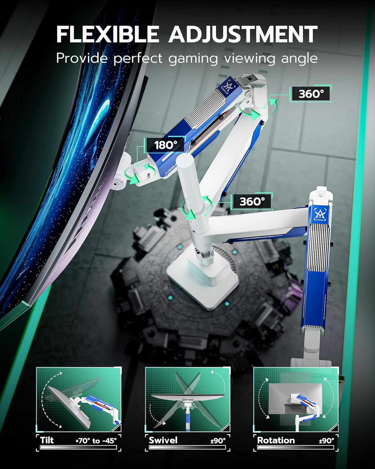 - 【Flexible Adjustability】This dual monitor mount allows for a wide range of movement, including +70 ° to -45 ° tilt, +90 ° to -90 ° swivel, 360 °rotation, providing an optimal ergonomic posture and relieving strain on the spine, neck, and shoulders. Fearturing the maximum height of 25.8 " and maximum arm extension of 29.7 ", the double monitor mount allows for various screen stacking ways, providing a comfortable experience for gaming or viewing