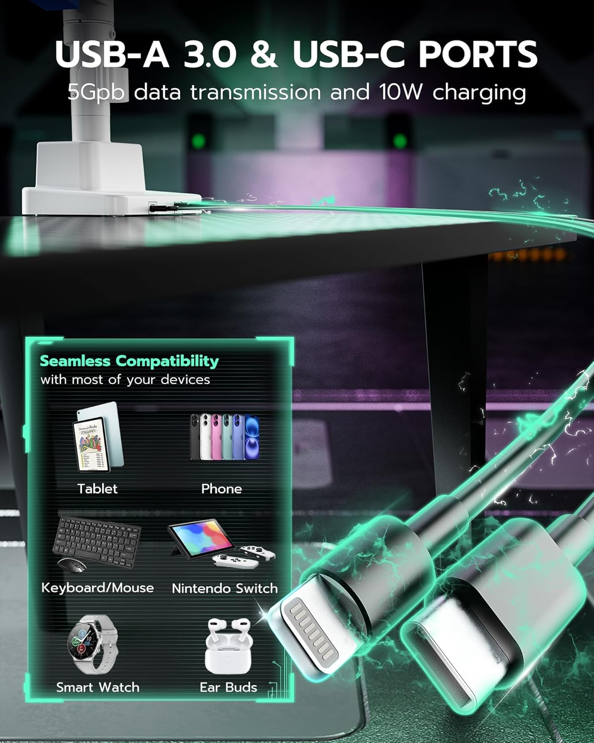 - 【Save Your Desktop】By mounting your two monitors on the arms, this ultrawide monitor arm can free up 50% valuable desktop space for you. The built-in cable management system neatly hides cables and cords out of sight, creating a cleaner and more organized workspace. What's more, the two integrated USB ports can provide convenient charging options for your phone, watch, tablet, laptop, and headphones at any time