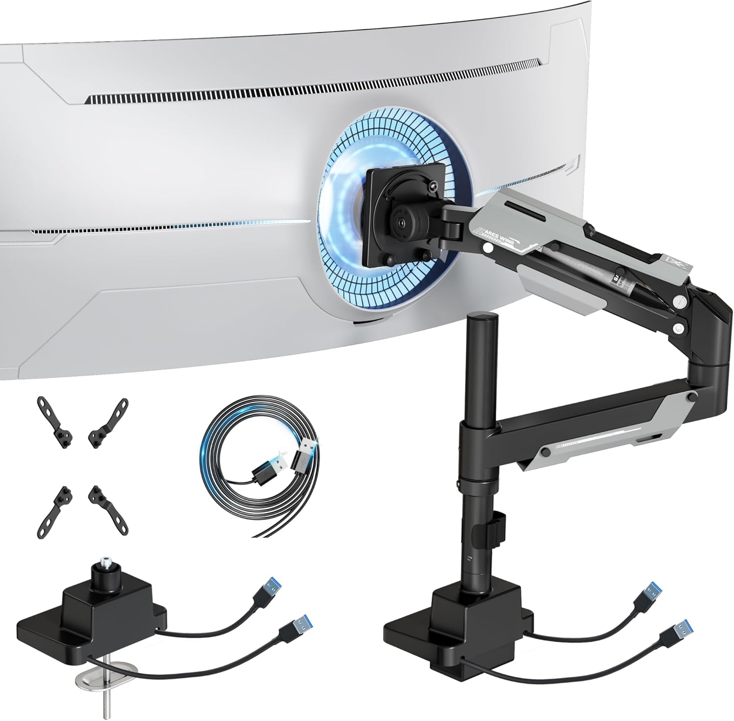 ARES WING Single Monitor Mount with USB, Ultrawide Monitor Arm for 24 to 57 Inch Heavy Duty Curved Screen, Adjustable Gas Spring Monitors Arm Stand up to 66LBS with 75/100/200 Vesa Mount, Black
