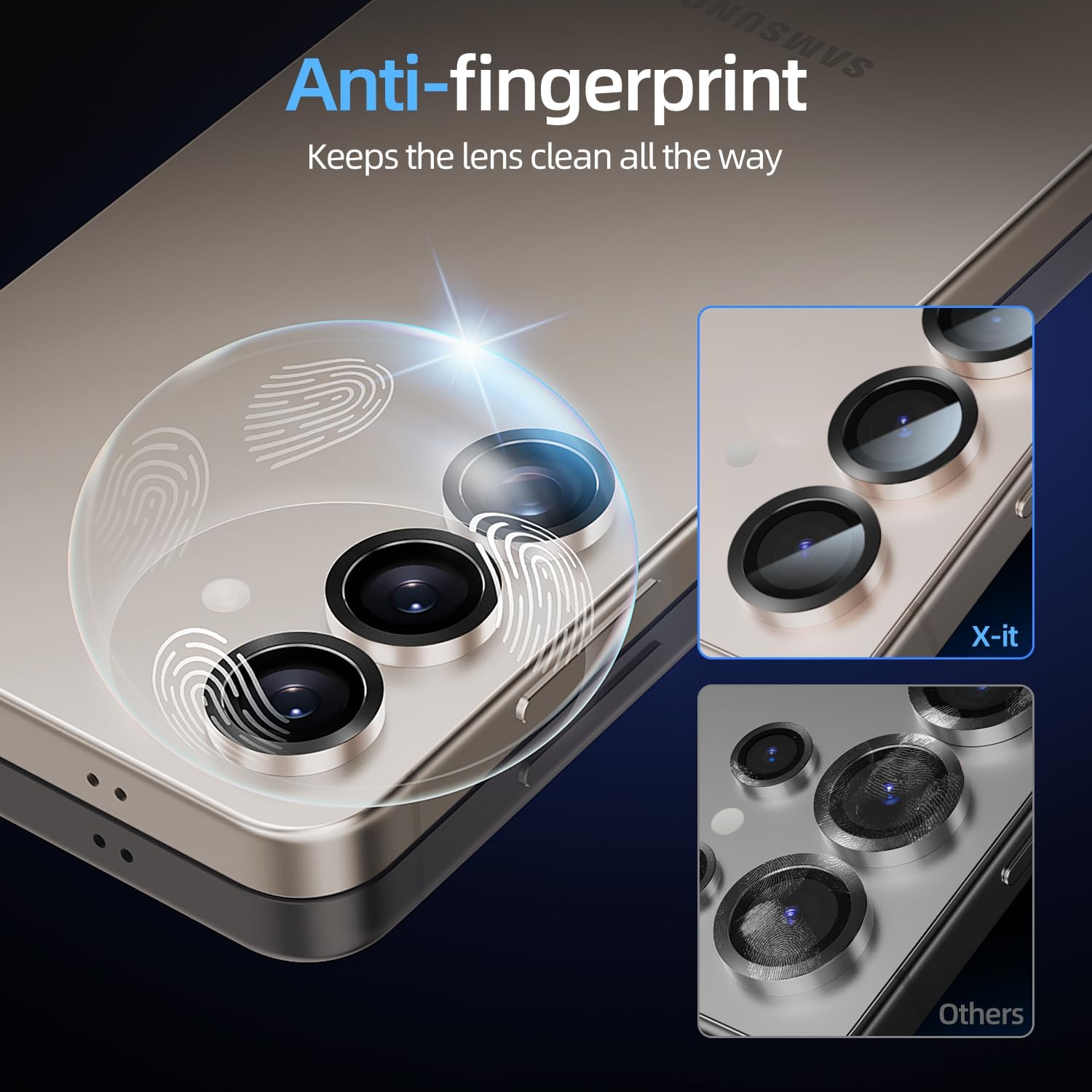 - [Military-grade protection, drop-proof and scratch-proof] X-it Samsung S25 lens protective film, high-density aluminum alloy frame + 12KG solid pressing edge process, using aluminum alloy materials commonly used in the aerospace field, bending strength increased by 50%, hardness up to 9H, scratch-resistant and wear-resistant, the lens is not afraid of sand and stone friction. Super hydrophobic coating, oil stains can be wiped clean, rainy and snowy weather does not affect imaging.