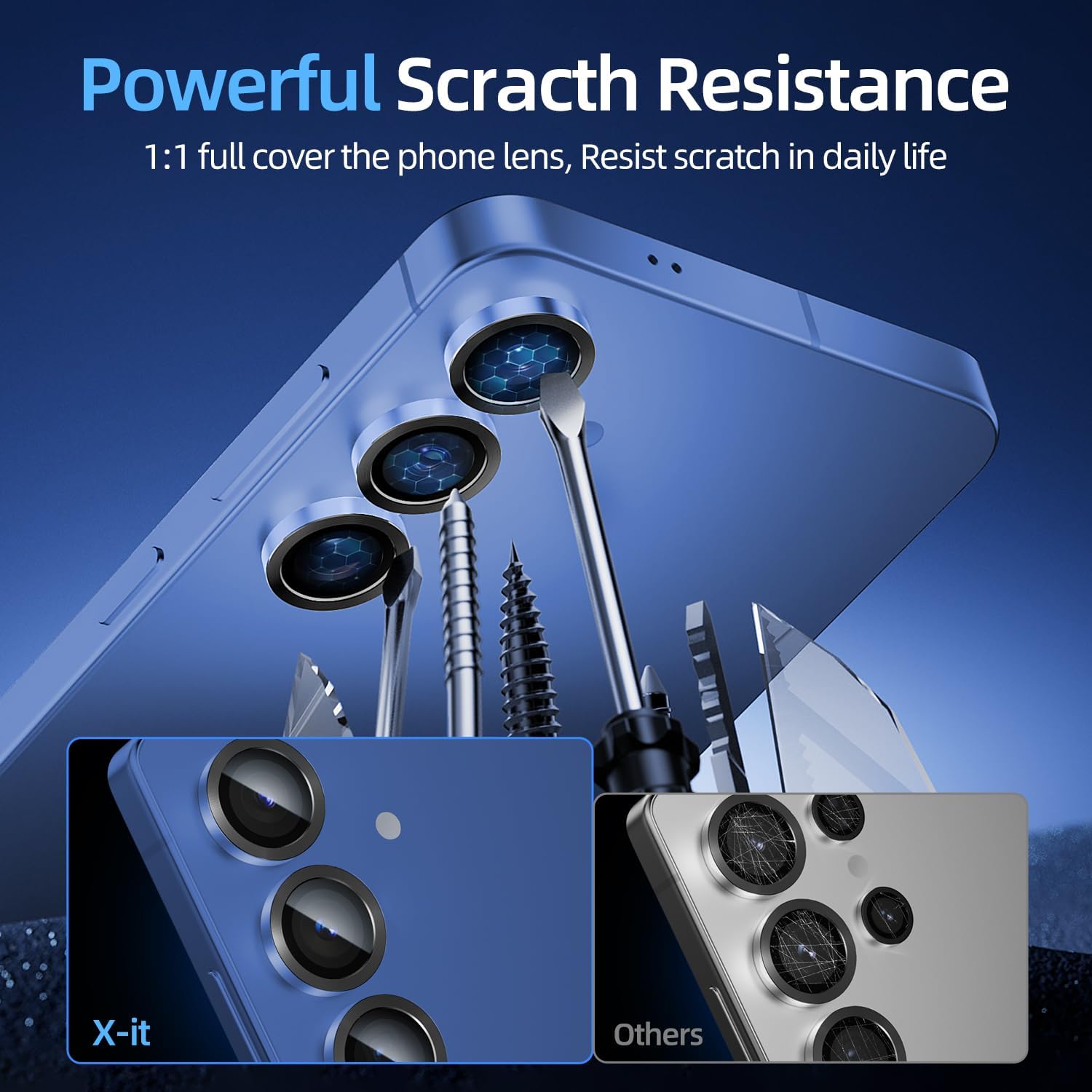 - [Military-grade protection, drop-proof and scratch-proof] X-it Samsung S25 lens protective film, high-density aluminum alloy frame + 12KG solid pressing edge process, using aluminum alloy materials commonly used in the aerospace field, bending strength increased by 50%, hardness up to 9H, scratch-resistant and wear-resistant, the lens is not afraid of sand and stone friction. Super hydrophobic coating, oil stains can be wiped clean, rainy and snowy weather does not affect imaging.