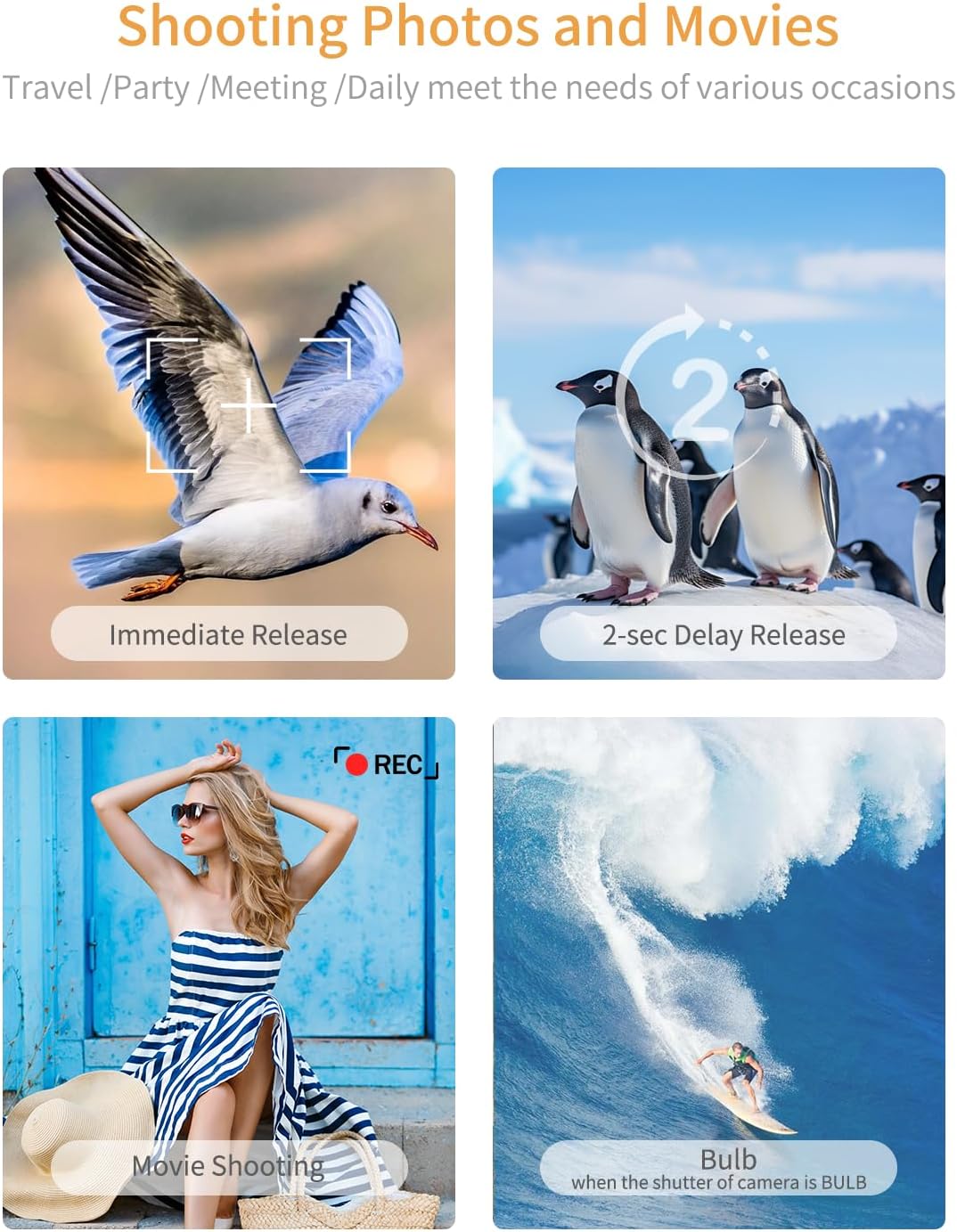 - Photo Shooting and Video Recording:This wireless shutter release for canon supports immediate Release, 2-sec Delay Release,shooting videos. It requires no line of sight to the camera with operating range up to 10m/32.8ft;The Long exposure function also available: when Camera was set to BULB exposure, Start/stop long exposures with a simple button press. Good aider for selfies, group photos, wild animals, macro photography, star trails, landscape photography