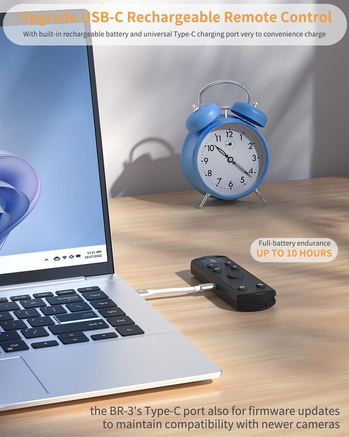 - Upgraded USB-C Rechargeable Design: This wireless remote control for canon cameras features a built-in rechargeable battery and a universal USB-C charging port, allowing you to conveniently charge it with your smartphone charger. With a full-battery endurance of up to 10 hours, this camera shutter remote control ensures reliable performance. Additionally, its USB-C port supports firmware updates to maintain compatibility with newer camera models.