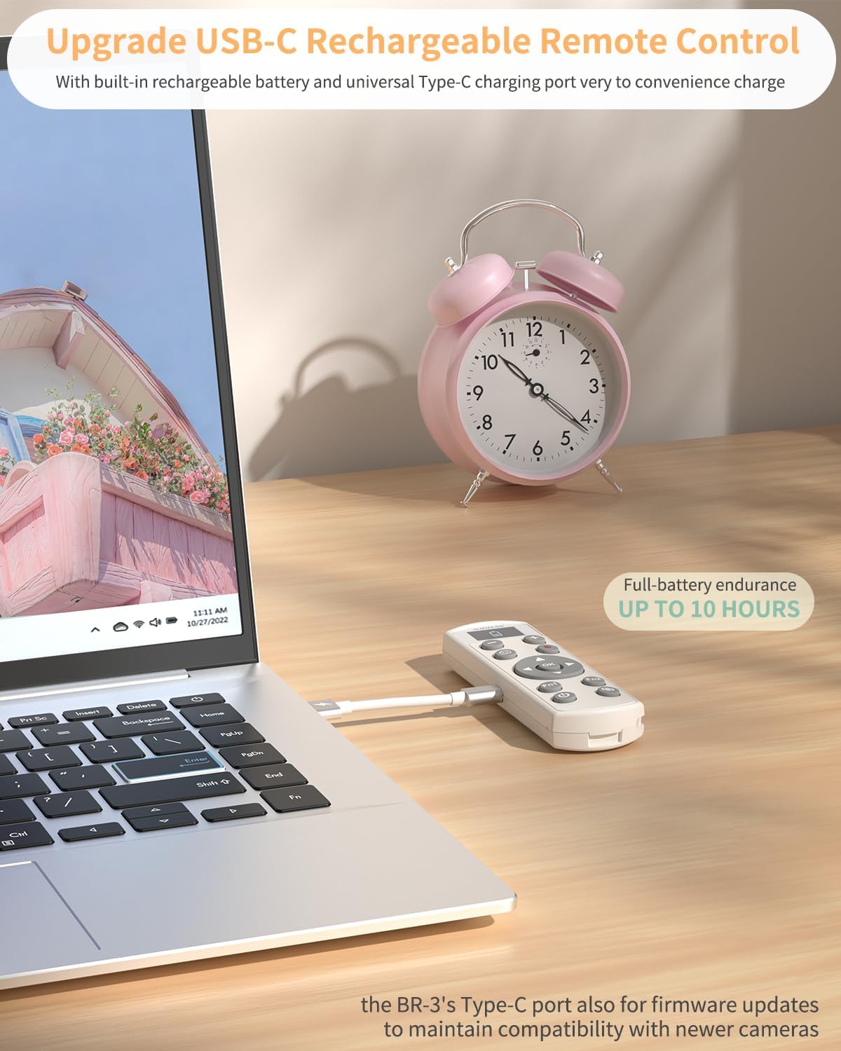 - 2.Upgraded USB-C Rechargeable Design: This wireless remote control for nikon cameras features a built-in rechargeable battery and a universal USB-C charging port, allowing you to conveniently charge it with your smartphone charger. With a full-battery endurance of up to 10 hours, this camera shutter remote control ensures reliable performance. Additionally, its USB-C port supports firmware updates to maintain compatibility with newer camera models.