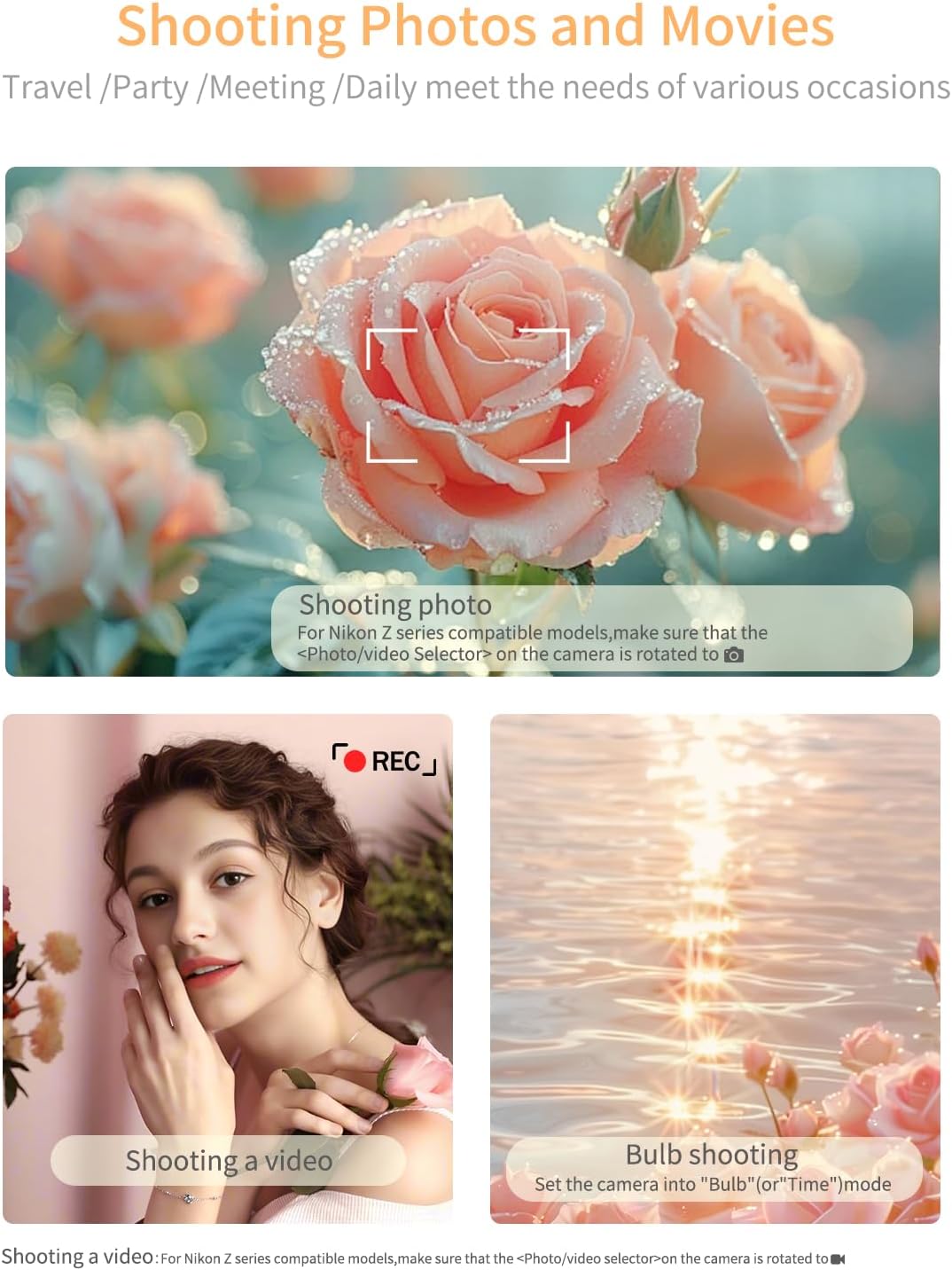 - 3.Photo Shooting and Video Recording:This wireless shutter release for nikon supports immediate Release,shooting videos. It requires no line of sight to the camera with operating range up to 10m/32.8ft;Good aider for selfies, group photos, wild animals, macro photography, star trails, landscape photography