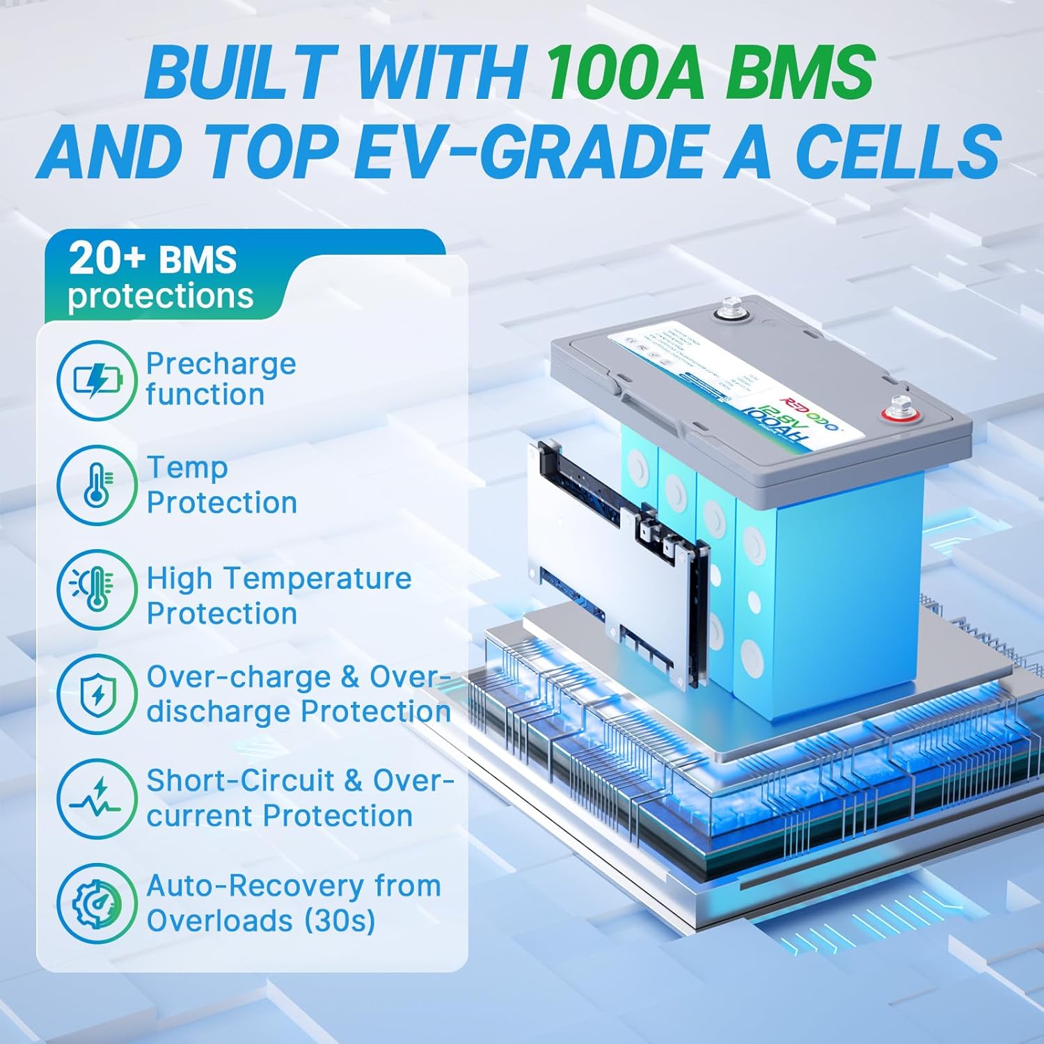 - 【 Built in100A BMS & Grade A Cells】Redodo 12V LiFePO4 battery 100Ah is built in 100A BMS to prevent the damage of 100Ah lithium battery from overcharging, over discharging, shortened, hightemp and overcurrent, realize comprehensive protection for the battery. Assemble with top-tier battery cells to guarantee stable battery performance, low self-discharging rate. With 10 years lifespan empower you no more budget for frequent battery replacements.