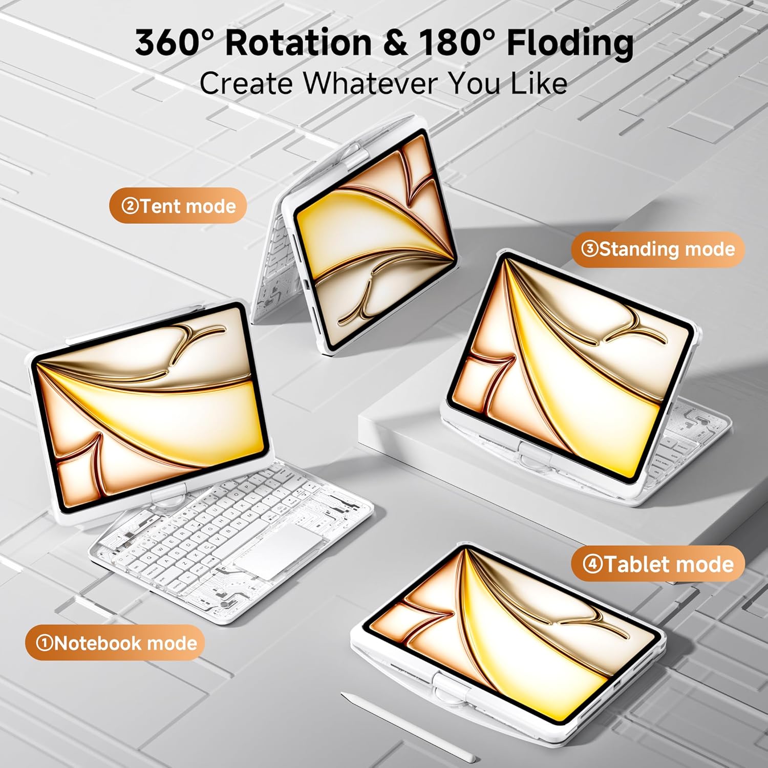 iPad Keyboard Case for 2024 M4 iPad Pro 13 inch, Magic Wireless Keyboard with Trackpad 7 Color Backlit, 360° Rotating Stand Transparent Protective Cover with Pencil Holder (White)