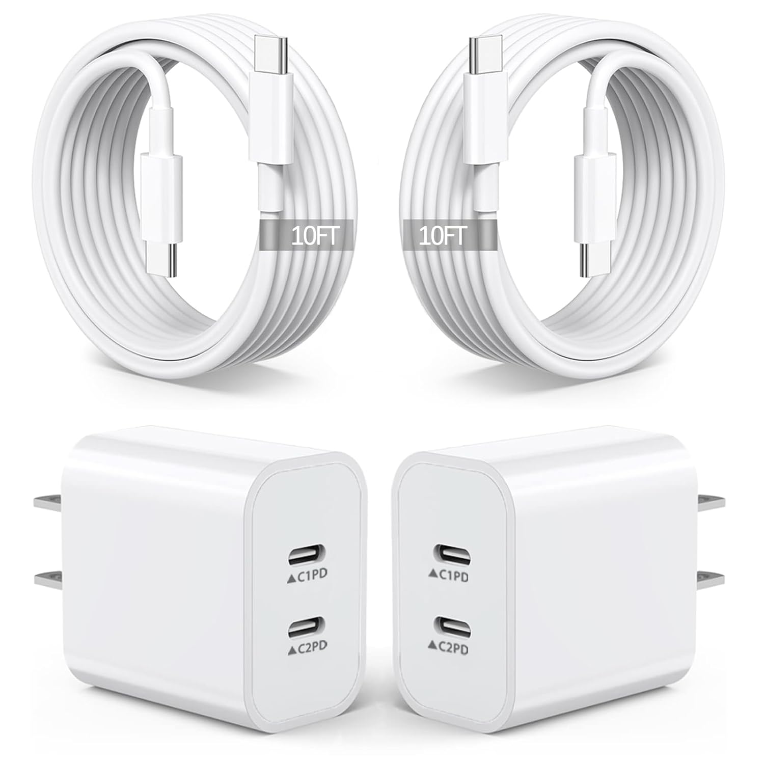 - [What You Get]2Pack Dual Port USB-C Charger Blocks and 2Pack 10ft USB C to USB C Charging Cables.
