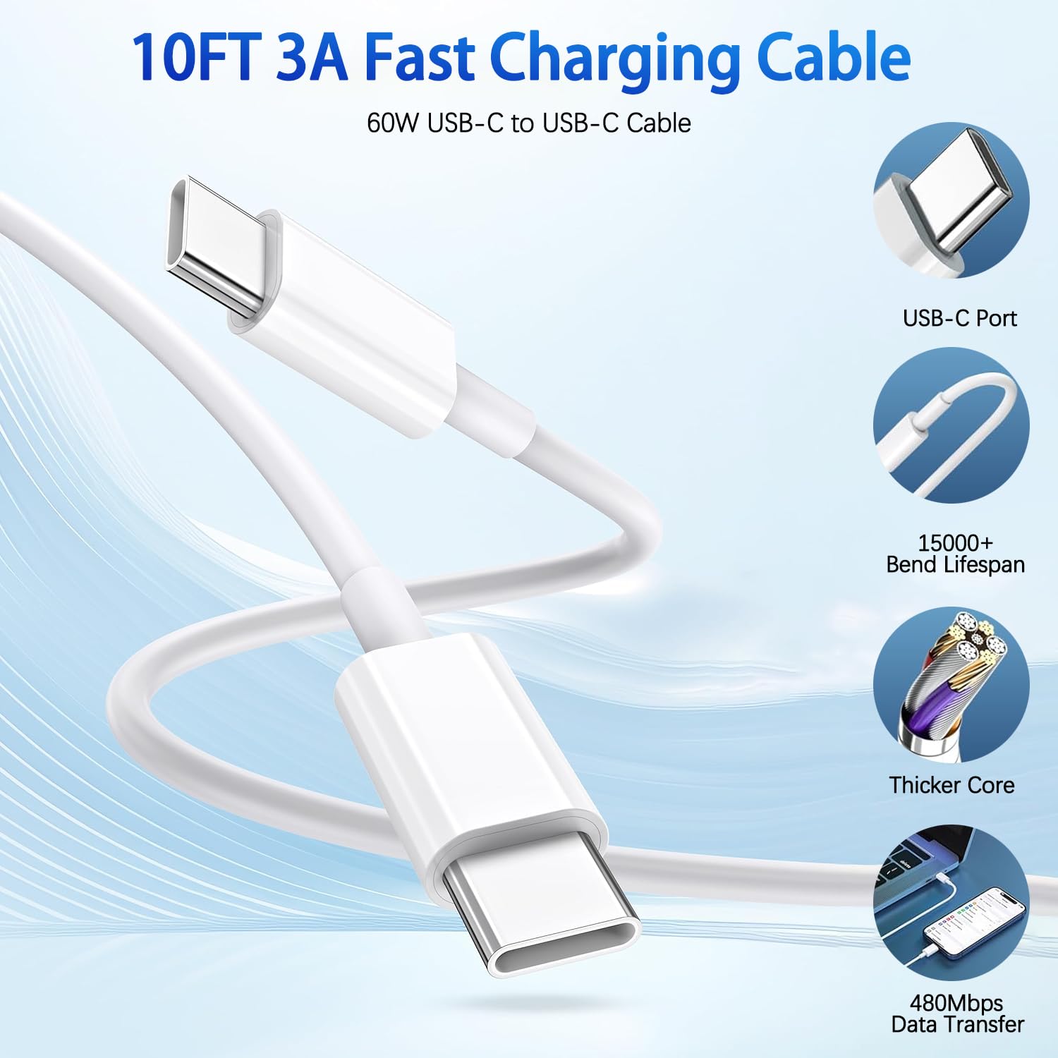 - [10FT Long Fast Charging Cable]Charging sets come with 2Pack of 10FT USB C to C fast charging cables cords,compatible with Apple IPhone 16/IPhone 16 Plus/IPhone 16 Pro/IPhone 16 Pro Max/IPhone 16e/IPhone 15/IPhone 15 Plus/IPhone 15 Pro/IPhone 15 Pro Max,iPad Pro 13/11 inch(M4),iPad Pro 12.9 inch 6th/5th/4th/3rd Gen,iPad Pro 11 inch 4th/3rd/2nd/1st Gen,iPad Air M3/M2/5th/4th Gen,iPad Mini 6th/7th Gen,iPad A16/10th,Galaxy S25/S24,Z Flip 6/5,Z Fold 6/5(NOTE: Not for iPhone 14 and previous versions)