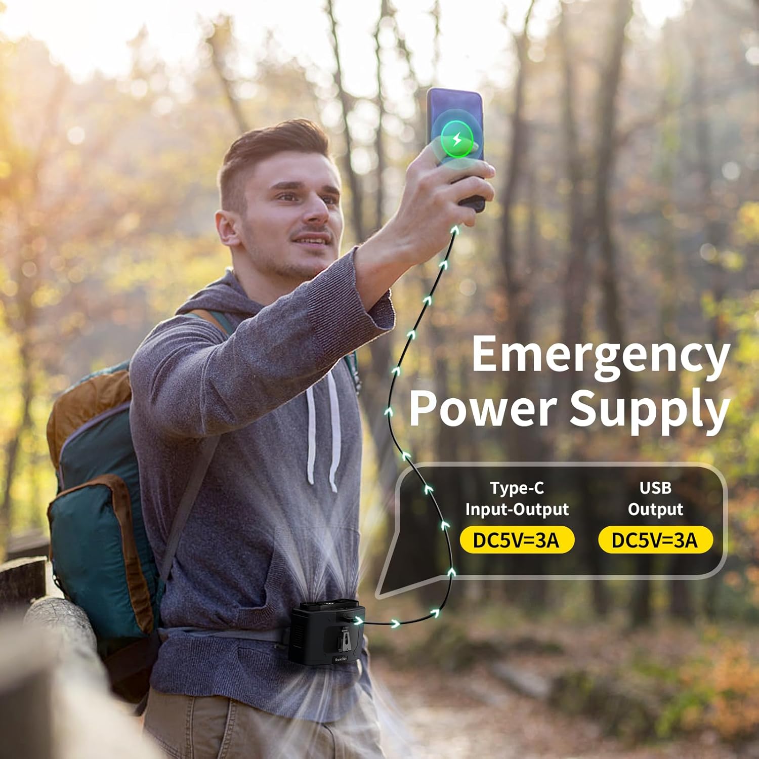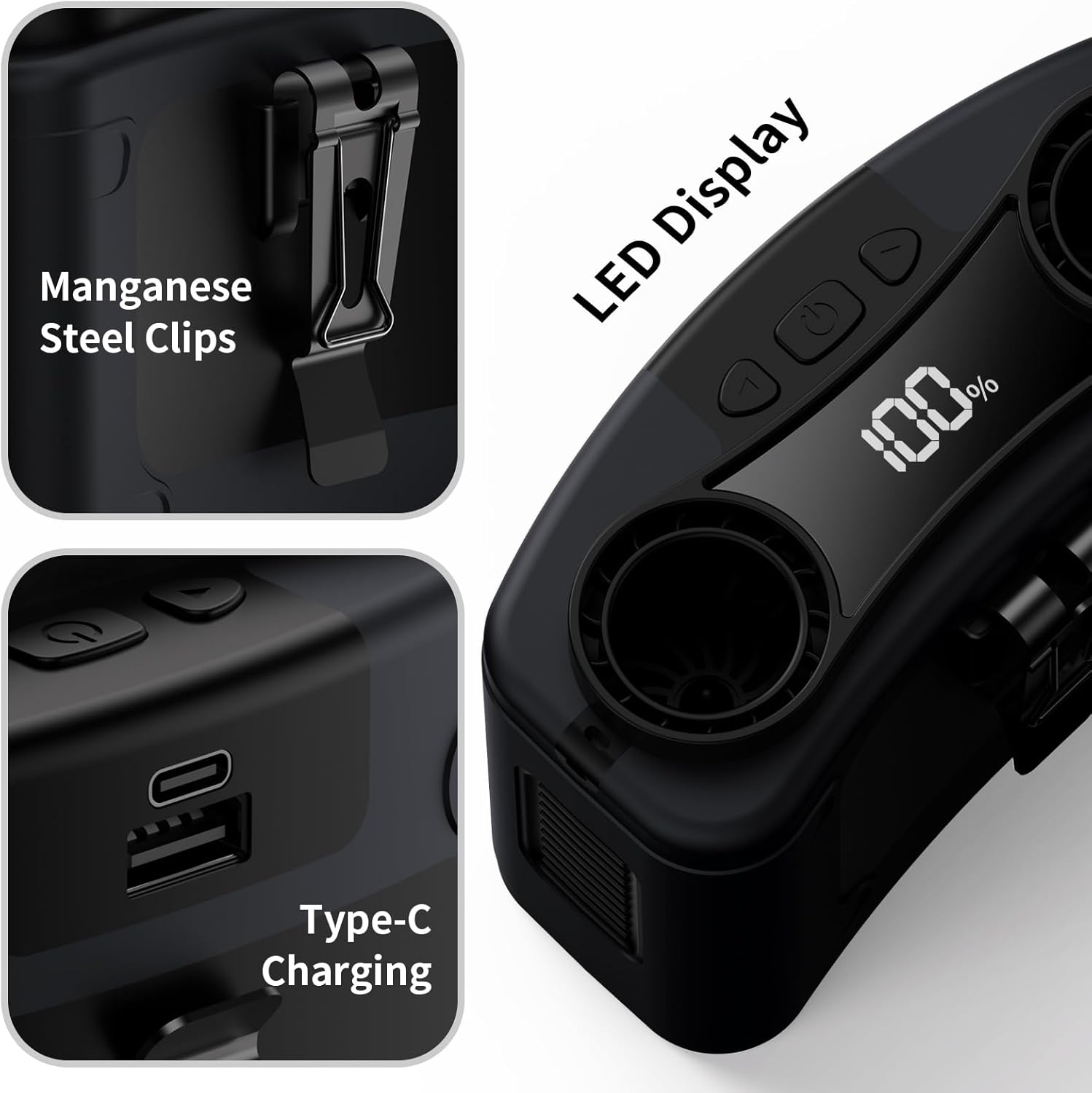 - 【Emergency Power Supply with LED Display】This waist rechargeable fan features a 5V-3A Type-C input for fast charging from USB chargers, laptops, and car chargers and a 5V-3A USB output to charge your phone during power outages or extreme weather. With an LED display design, clearly shows wind speed and battery life, allowing for quick adjustments and timely charging