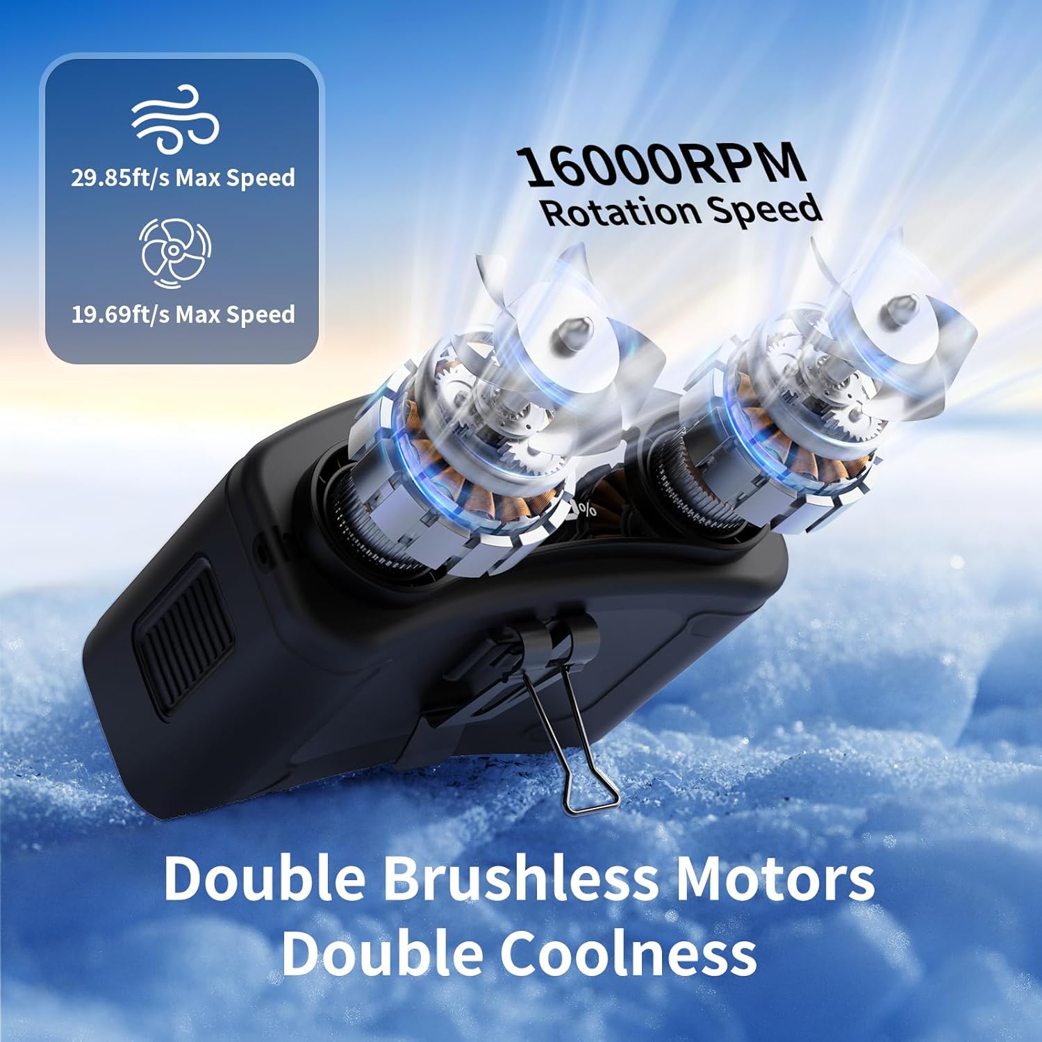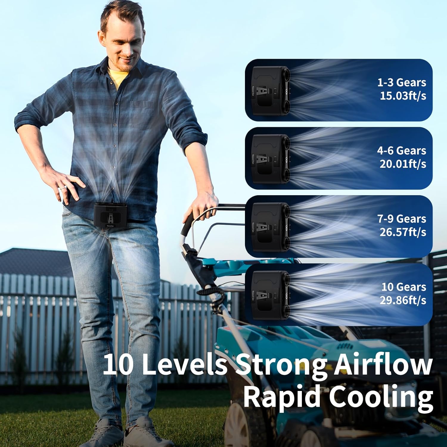 - 【10 Levels Power Wind with Dual Motors】The cooling fan features dual high-speed brushless motors with a max speed of 16000 RPM, airflow up to 29.85ft/s, and air supply distance up to 8.2ft. With 10-gear adjustable wind speeds ranging from natural to strong and double air outlets for double cooling, this waist fan is ideal for outdoor construction workers, farmers