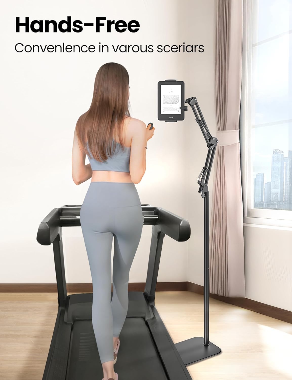- Fexible Floor Stand: The tablet floor stand adjusts from 28" to 58" in height. Whether you're lying down, sitting, or standing, the 360° rotatable ball joint and flexible arm let you easily find the perfect position on your bed, sofa, or recliner. The dual-support arm design adds extra stability and reliability.