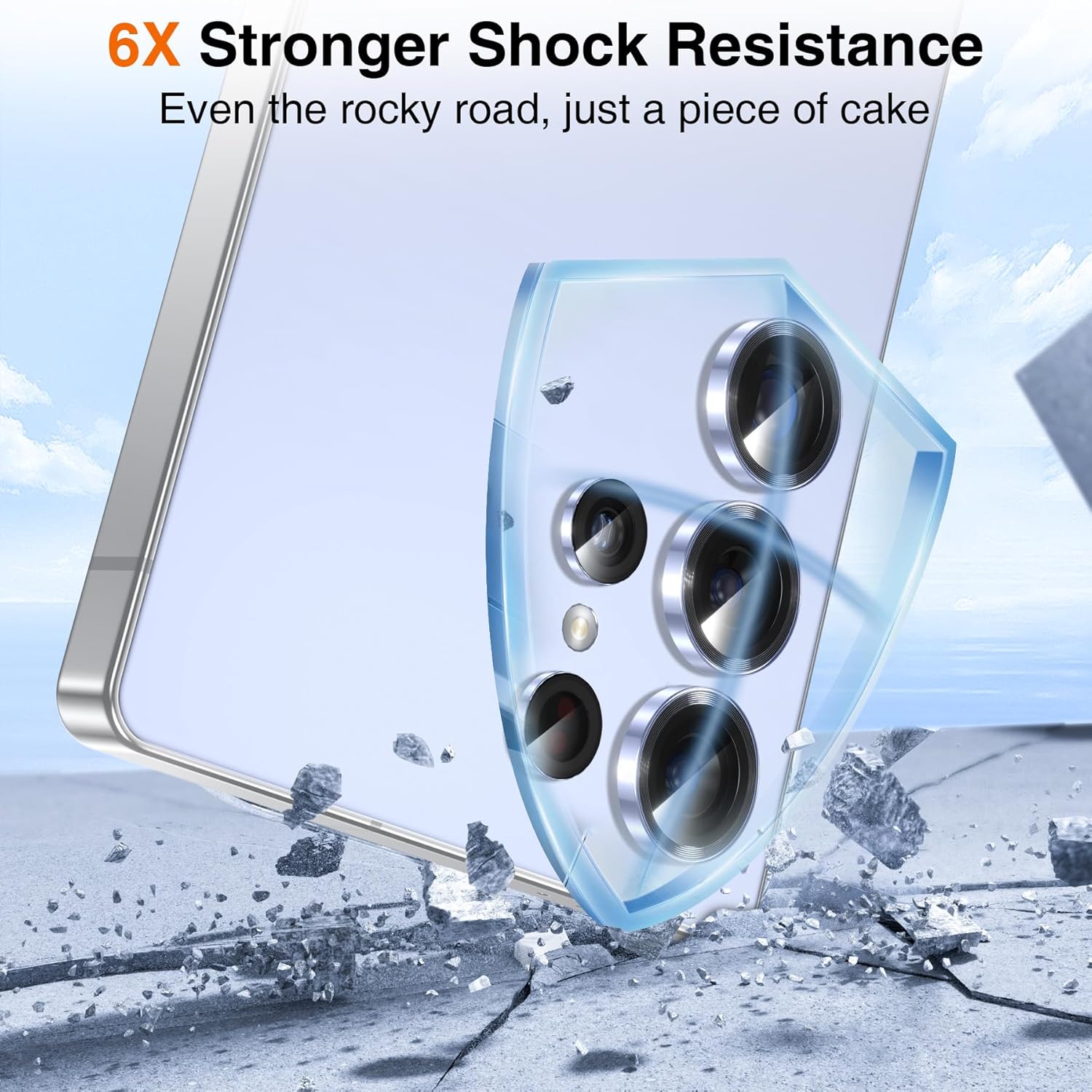 - 6X Stronger & 5Th Gen Oleophobic Coating: 6X crash-proof tempered glass, made of 9H hardness sapphire coated tempered glass and aviation aluminum alloy, with secondary reinforcement coating, pressure up to 30KG, liking an armor on the Galaxy S25 Ultra camera lens protector, even the rocky ground can perfectly resist. The 5th gen of oil-proof, making fingerprint and oil isolated automatically, keeping the lens clean as new all the time.