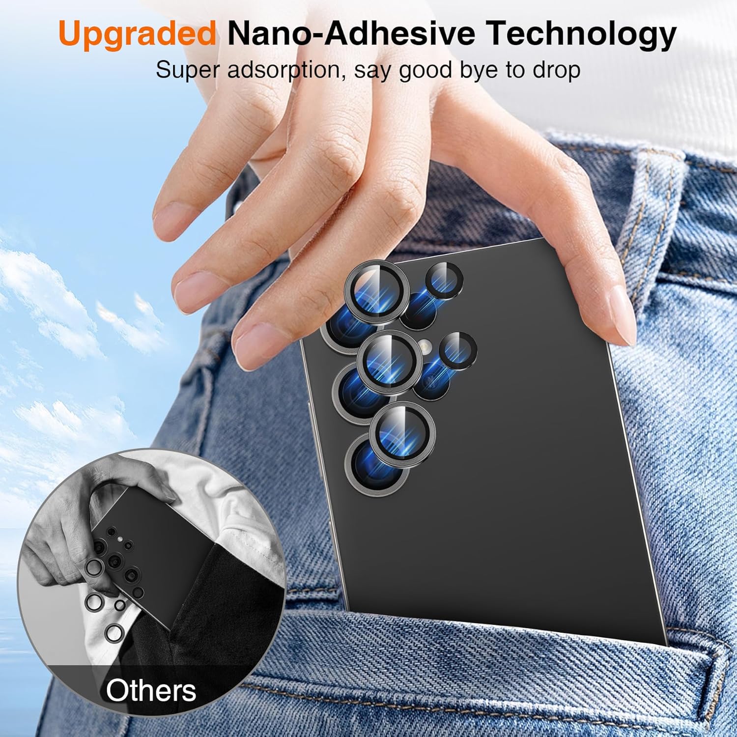 - Upgraded Nano-Adhesive Technology: The Samsung Galaxy S25 Ultra camera protector adopts the newest developed flexible adsorption technology to protect camera from all angle, dust free and waterproof, fitting tightly does not easy to fall off. Using removal tool if you want change, don’t worry about residual glue and it isn’t damage the camera.