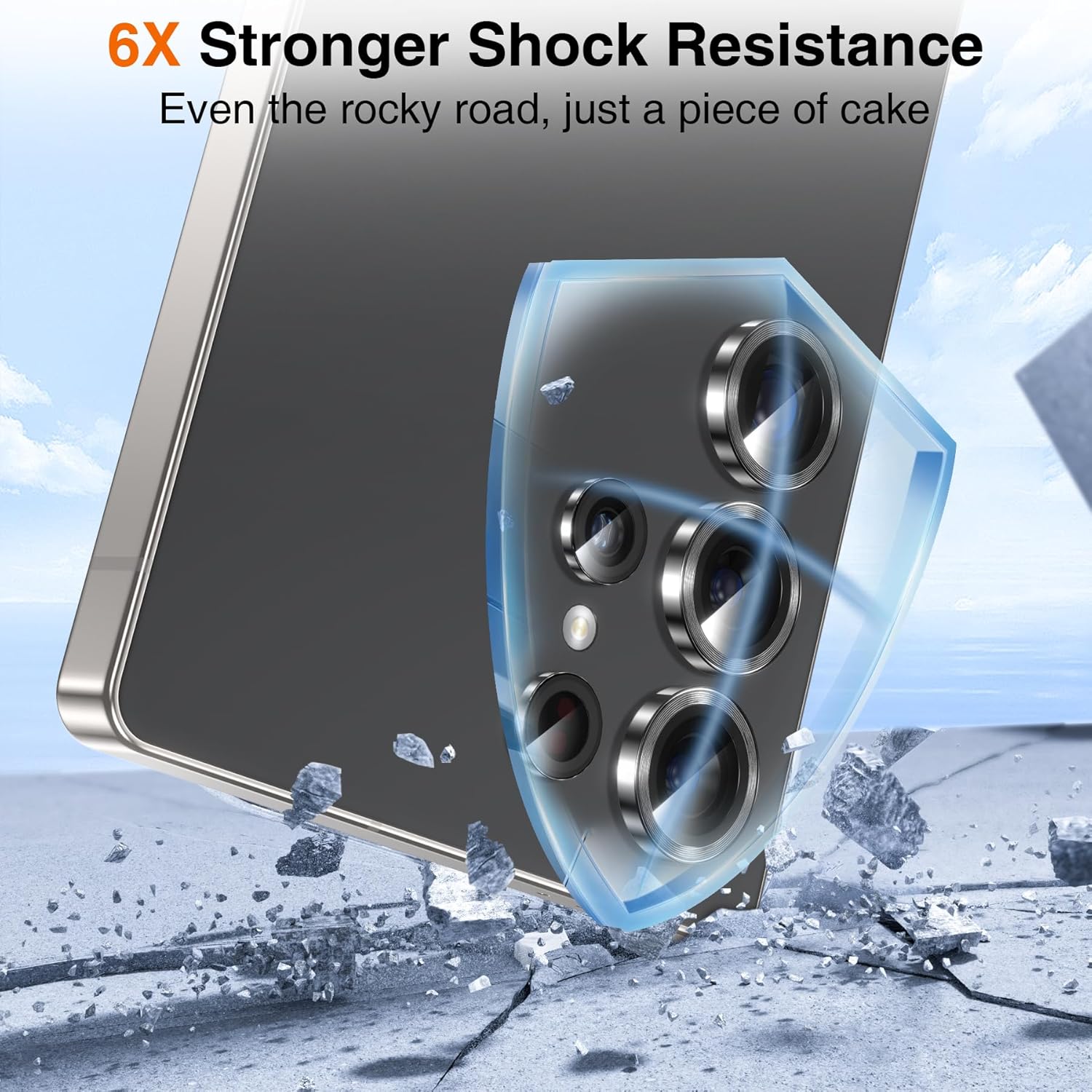 - 6X Stronger & 5Th Gen Oleophobic Coating: 6X crash-proof tempered glass, made of 9H hardness sapphire coated tempered glass and aviation aluminum alloy, with secondary reinforcement coating, pressure up to 30KG, liking an armor on the Galaxy S25 Ultra camera lens protector, even the rocky ground can perfectly resist. The 5th gen of oil-proof, making fingerprint and oil isolated automatically, keeping the lens clean as new all the time.