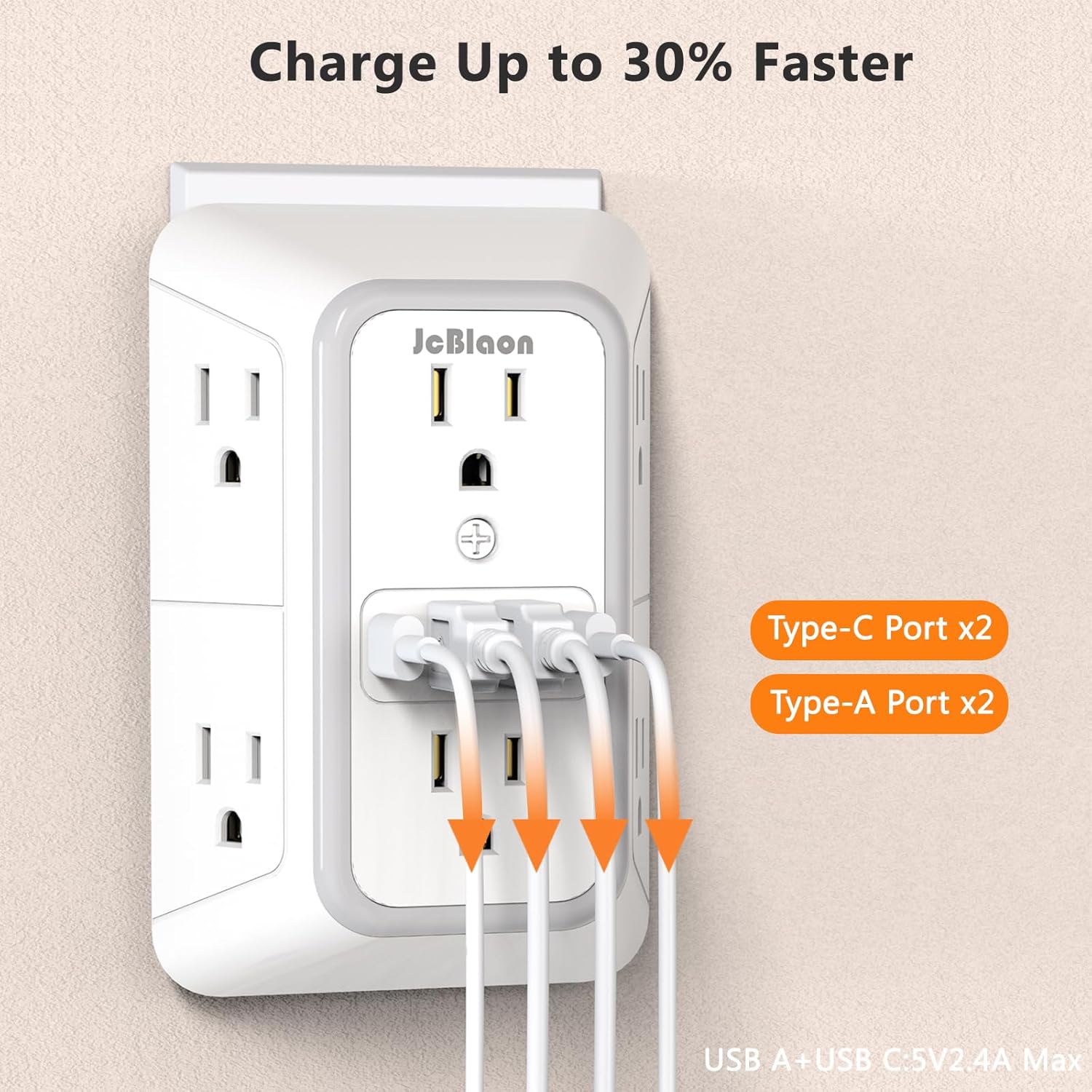 - 【Wall Plugs with USB Ports】The extra plug wall outlet features 2 USB-A ports and 2 USB-C port. Each USB port features 5V/2.4A Max output. Built-in smart technology, detecting charging devices and delivering optimal charging speed automatically, compatible with most USB devices. NOTE: The UCB-C port doesn't support any other devices which need 14~22V charging voltage.