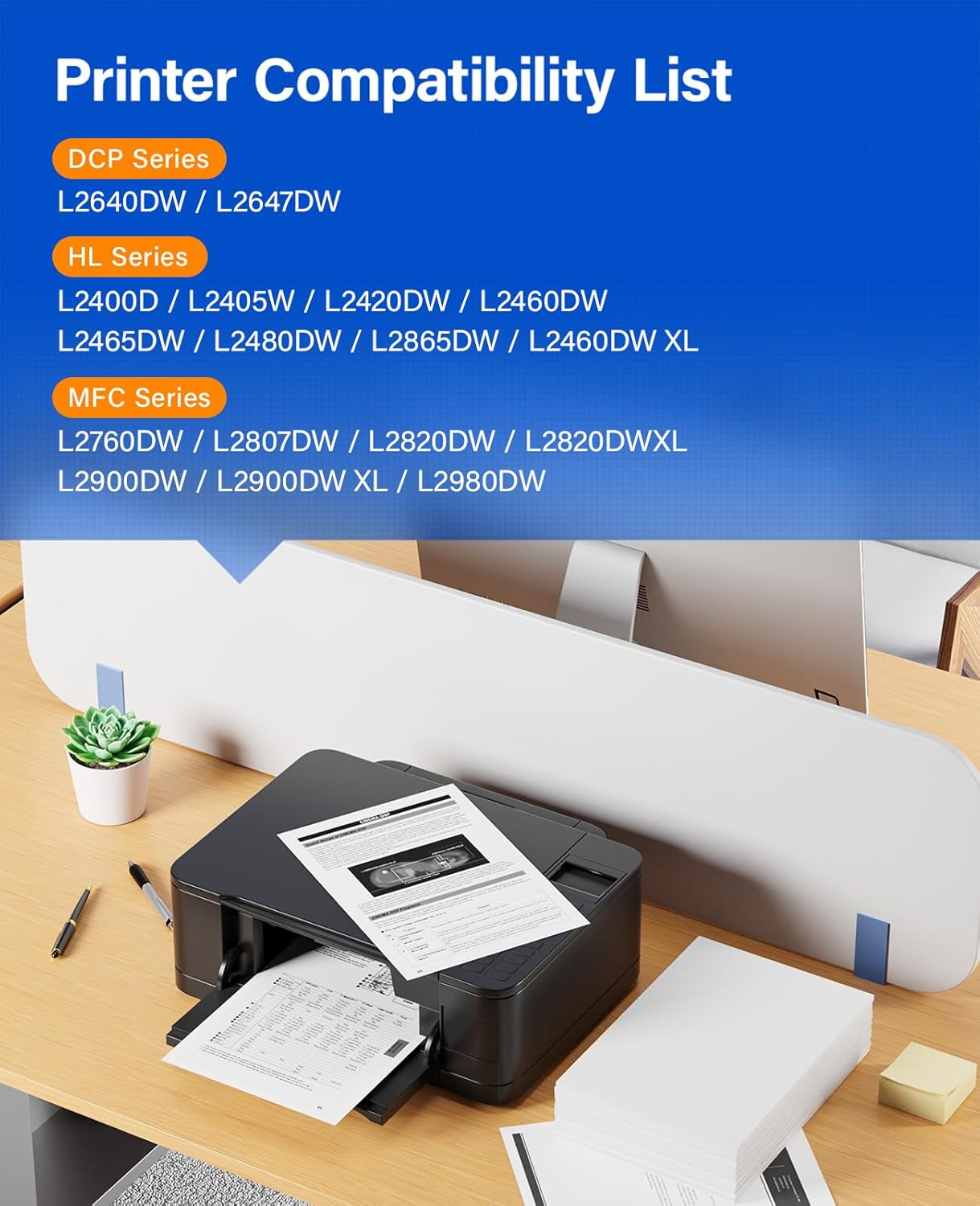- Compatible Printer: Compatible with Brother HL-L2400D, HL-L2405W, HL-L2420DW, HL-L2460DW, HL-L2465DW, HL-L2467DW, HL-L2480DW, HL-L2865DW, HL-L2460DW XL, MFC-L2760DW, MFC-L2807DW, MFC-L2820DW, MFC-L2820DW XL, MFC-L2900DW, MFC-L2900DW XL, MFC-L2980DW, DCP-L2640DW, DCP-L2647DW (Please check that your printer model matches the printer model of this toner cartridge before placing an order).