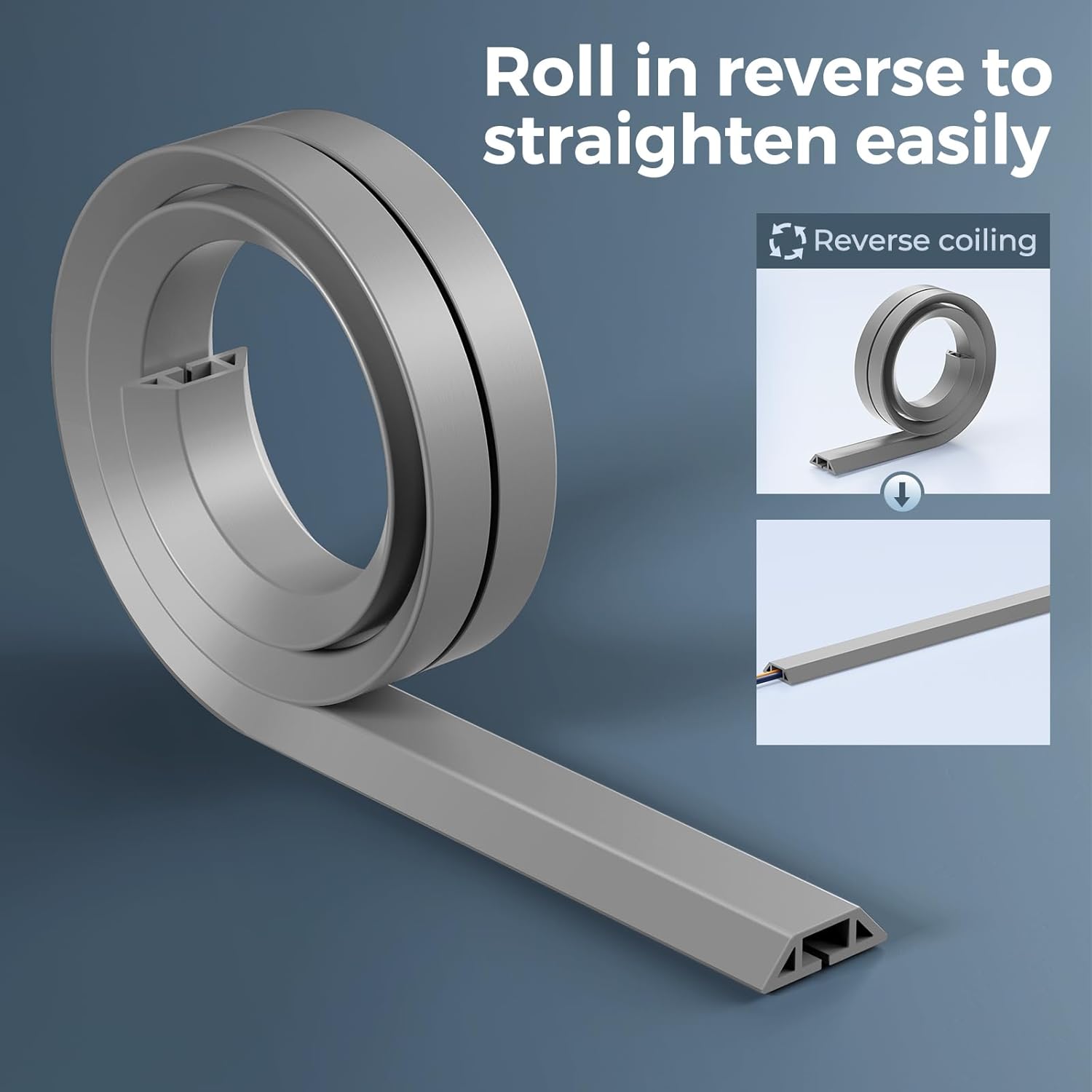 - 【Straighten in one step, avoid bending】Simply roll this floor cable cover in reverse to flatten and straighten in no time - no more stubborn kinks or messy wires! Save time compared to traditional rigid channels.No tools required! The semi-enclosed base can be easily torn open by hand - just press the cable inside and close it quickly to get organized in no time