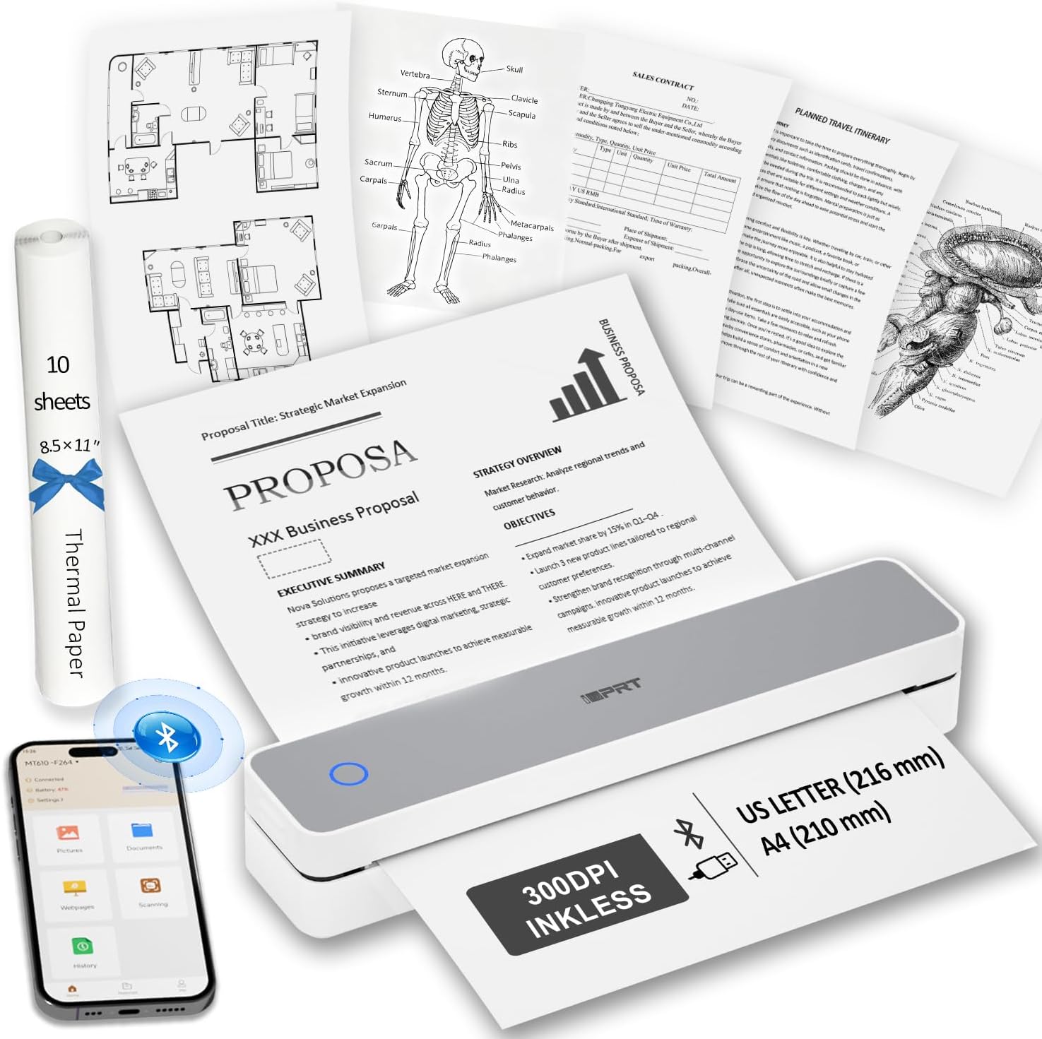 Inkless Portable Printer for Travel, 300DPI Wireless Thermal Printer Support 8.5" x 11" US Letter, A4, MT610Pro Small Bluetooth Printers Compatible with iOS, Android Laptop for Home Office Car, Grey
