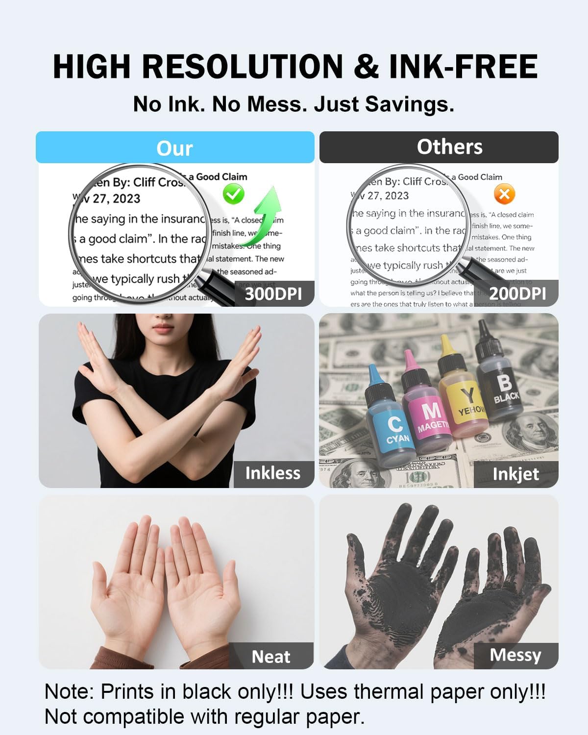 - ✅ Ultra Light Travel Printer– At just 1.1lb (526g) and 1.6 inches thick, this portable thermal printer fits easily into your backpack or work bag. Whether you're on a business trip, campus, café, or coworking space, print contracts, lecture notes, or documents on the go—no desk needed!