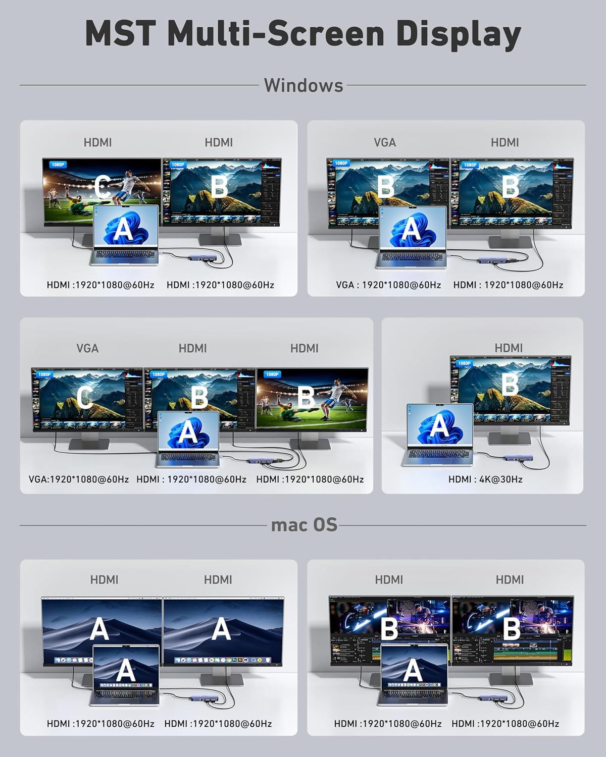 - MultiScreen Solution - With MST feature support, BENFEI USB Type-C HUB could support up to 3 maximum screen output, 2*HDMI and VGA. The screen could be identical or different depends on your computer setting. The resolutions could be up to 3840*2160@30Hz, 1920x1080@60Hz (1080p Full HD) including 720p, 1600x1200; Please pay attention: the supported resolution is up to the output combination, please refer to the product description.