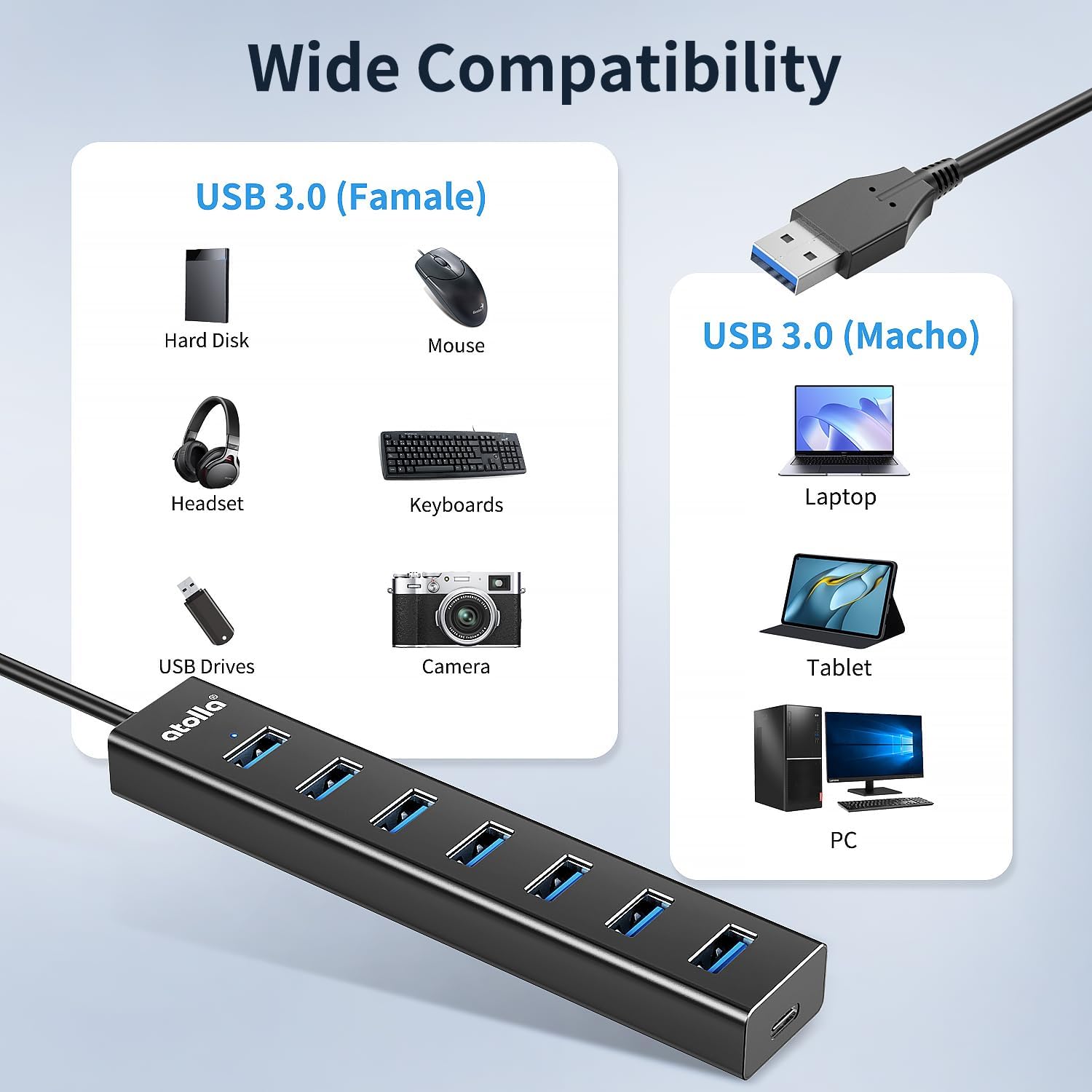 atolla Aluminum 7-Port USB 3.0 Hub with 1m Extension Cable - 5Gbps High-Speed Data Transfer for MacBook Pro, Laptop, PC, Gaming Setup