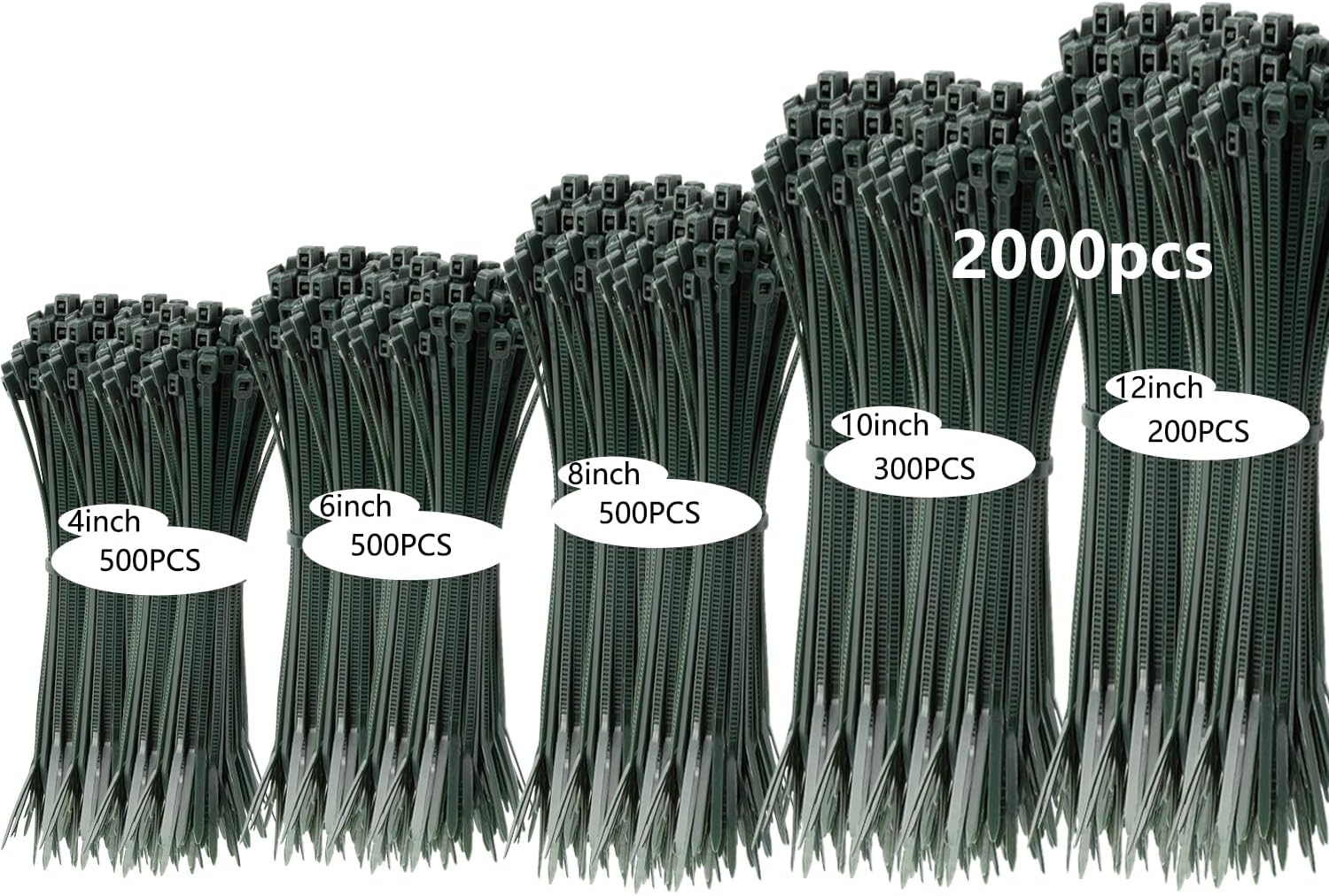 - 【Packages include】2000 pcs cable ties (4 inch 500pcs , 6 inch 500pcs , 8 inch 500pcs , 10 inch 300 pcs ,12 inch 200 pcs). Different sizes of cable ties basically meet your daily or working needs.
