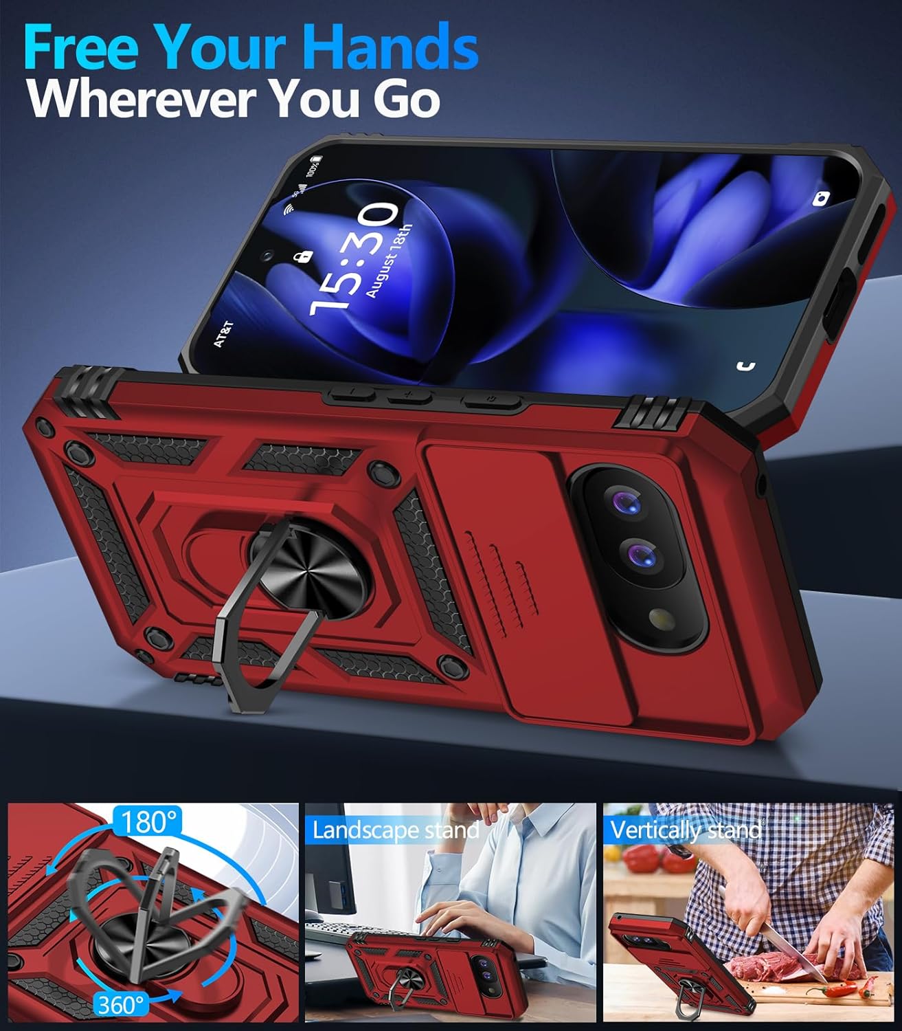 Taisairu for Google Pixel 9A Case with Screen Protector & Slide Camera Lens Cover, Built-in 360°Rotate Magnetic Ring Stand Shockproof Protective Phone Case for Google Pixel 9A Case (Red)