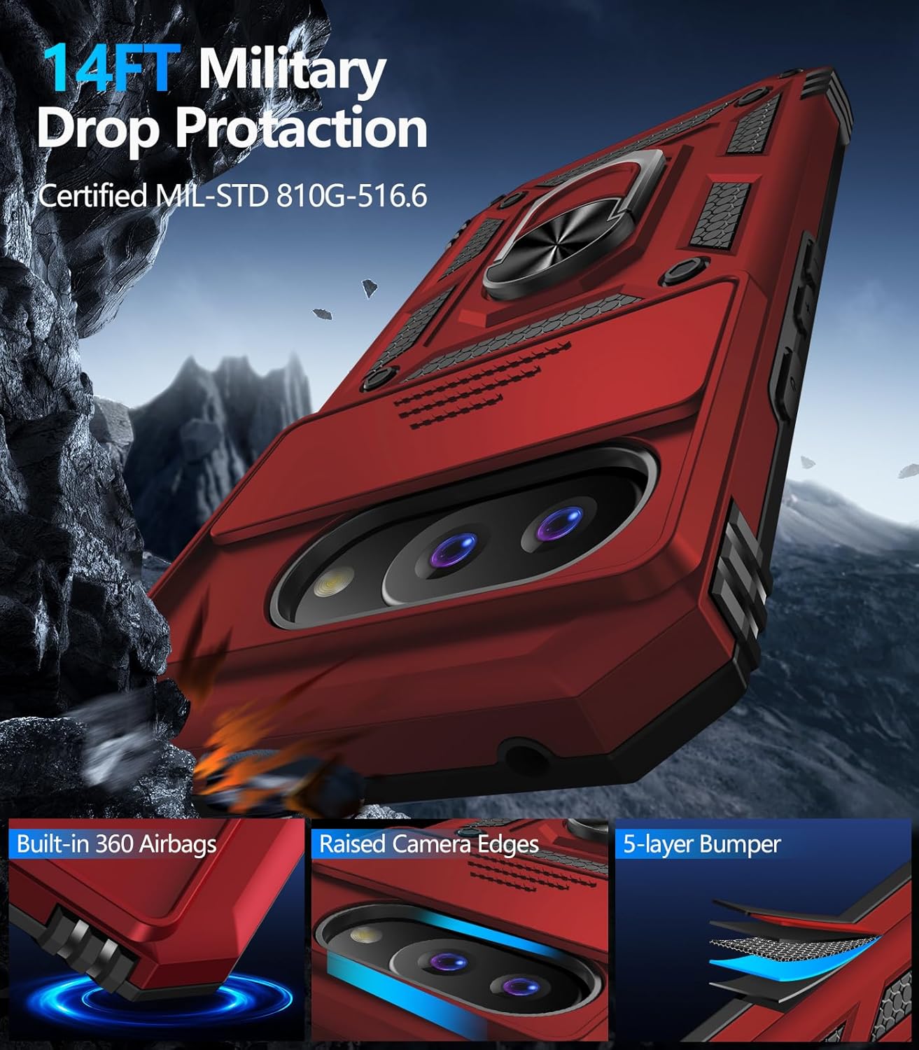 - 【Full Body Protection】For Google Pixel 9A Phone Case is military-grade drop protection. It has exclusive Shock 360° airbags around edges and strong TPU rubber bumpers on the outside edges for shock absorption if dropped. The internal air pad corners as bumpers are rounded and bubble out safely, giving extra room against corner shattering. What's more, Slide Camera Lens Cover, 1.5 mm bezels over the screen and 0.5 mm raised corner lips on the back provides extra and comprehensive protection.